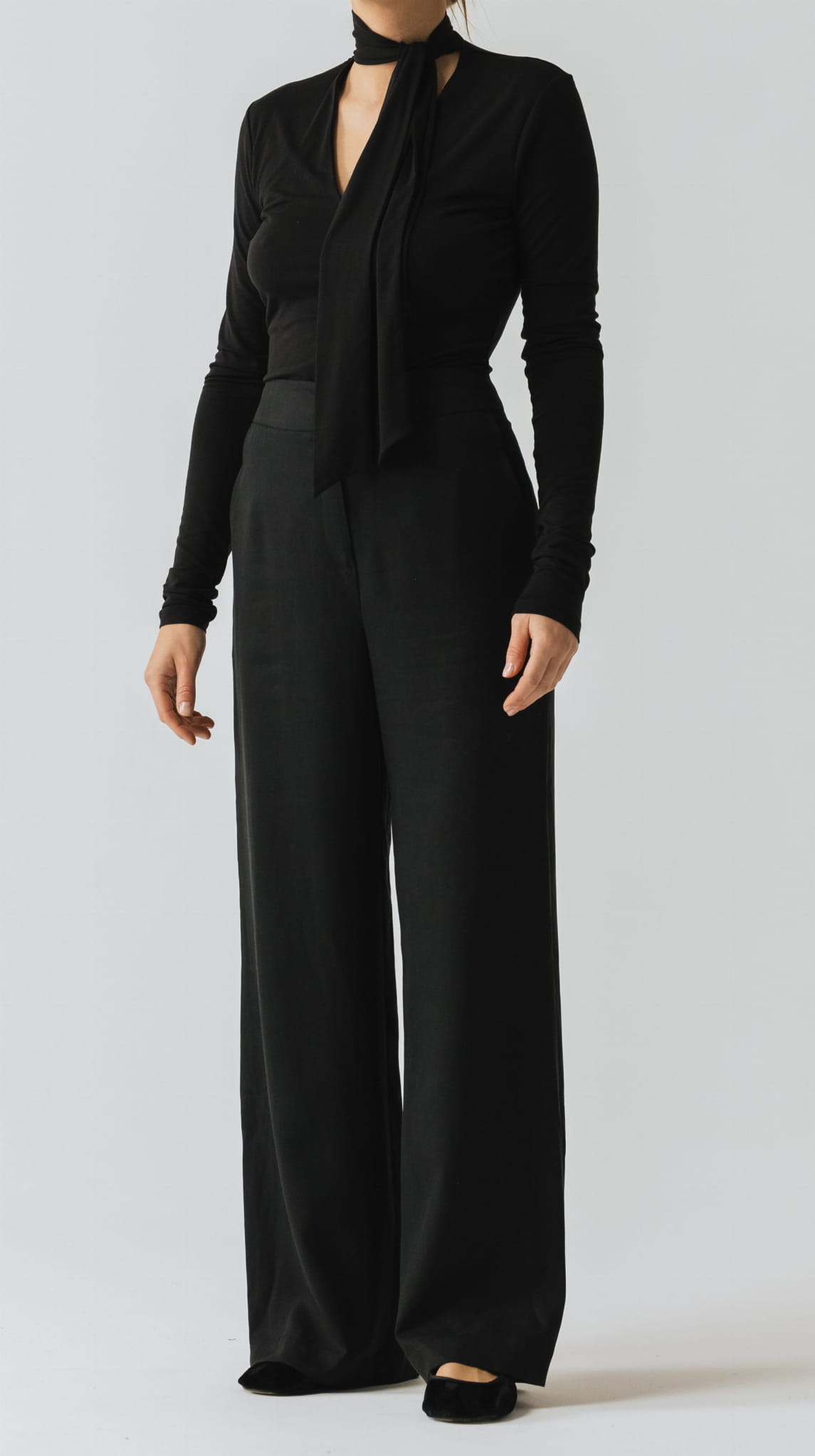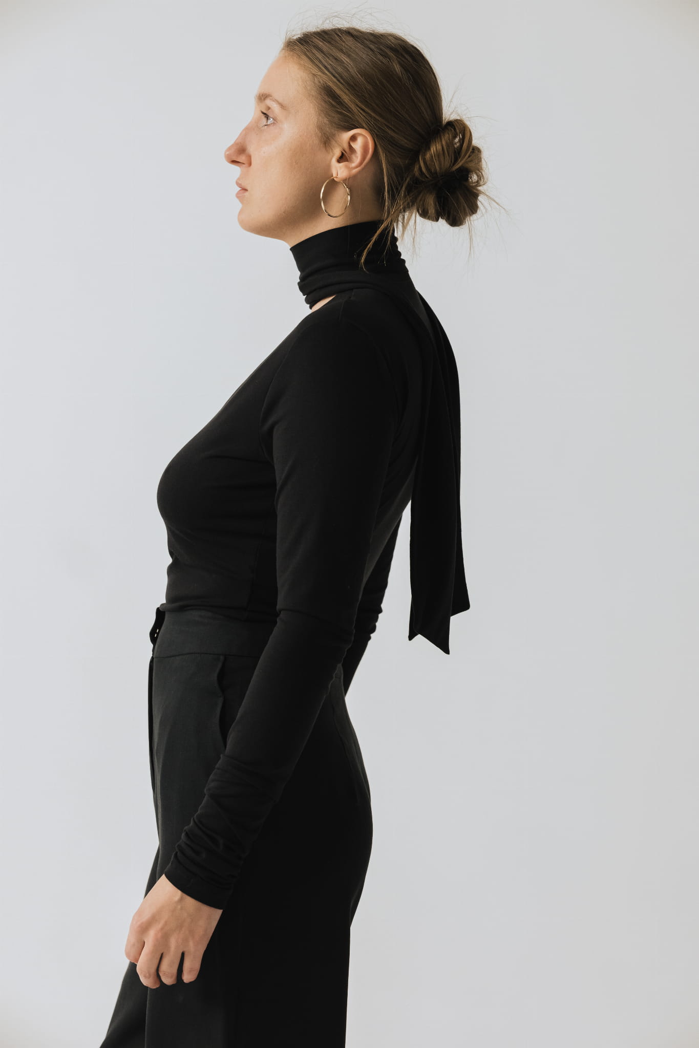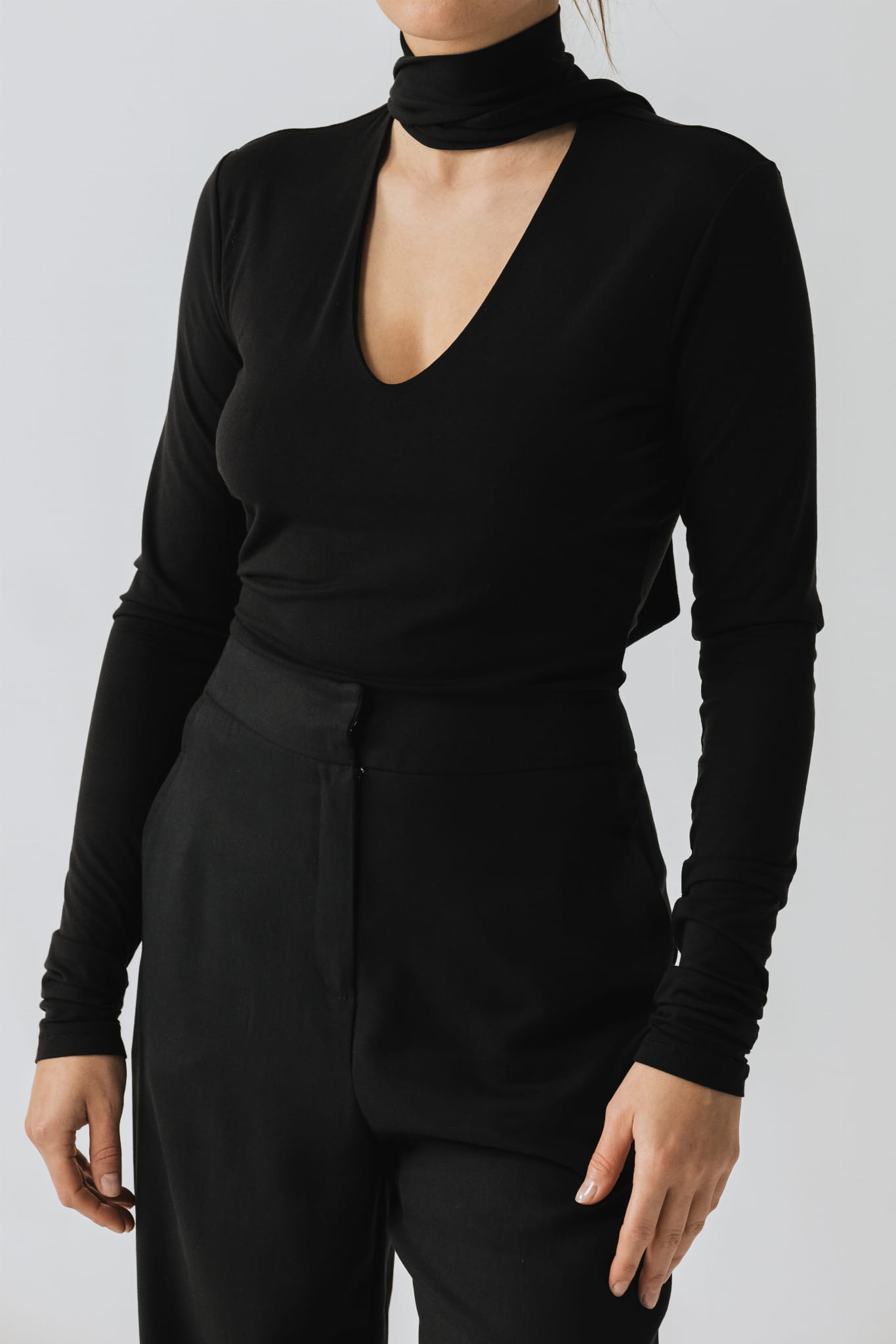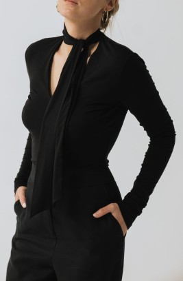 Dzianinowa bluzka z długim rękawem, dekoltem V i szarfa pod szyją. Przylegająca do ciała, elegancko eksponuję dekolt w literę V, w miejscu biustu posiada dodatkową warstwę dzianiny dla zachowania maksymalnego komfortu.