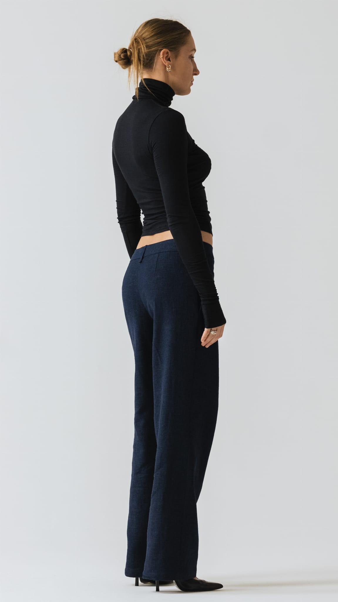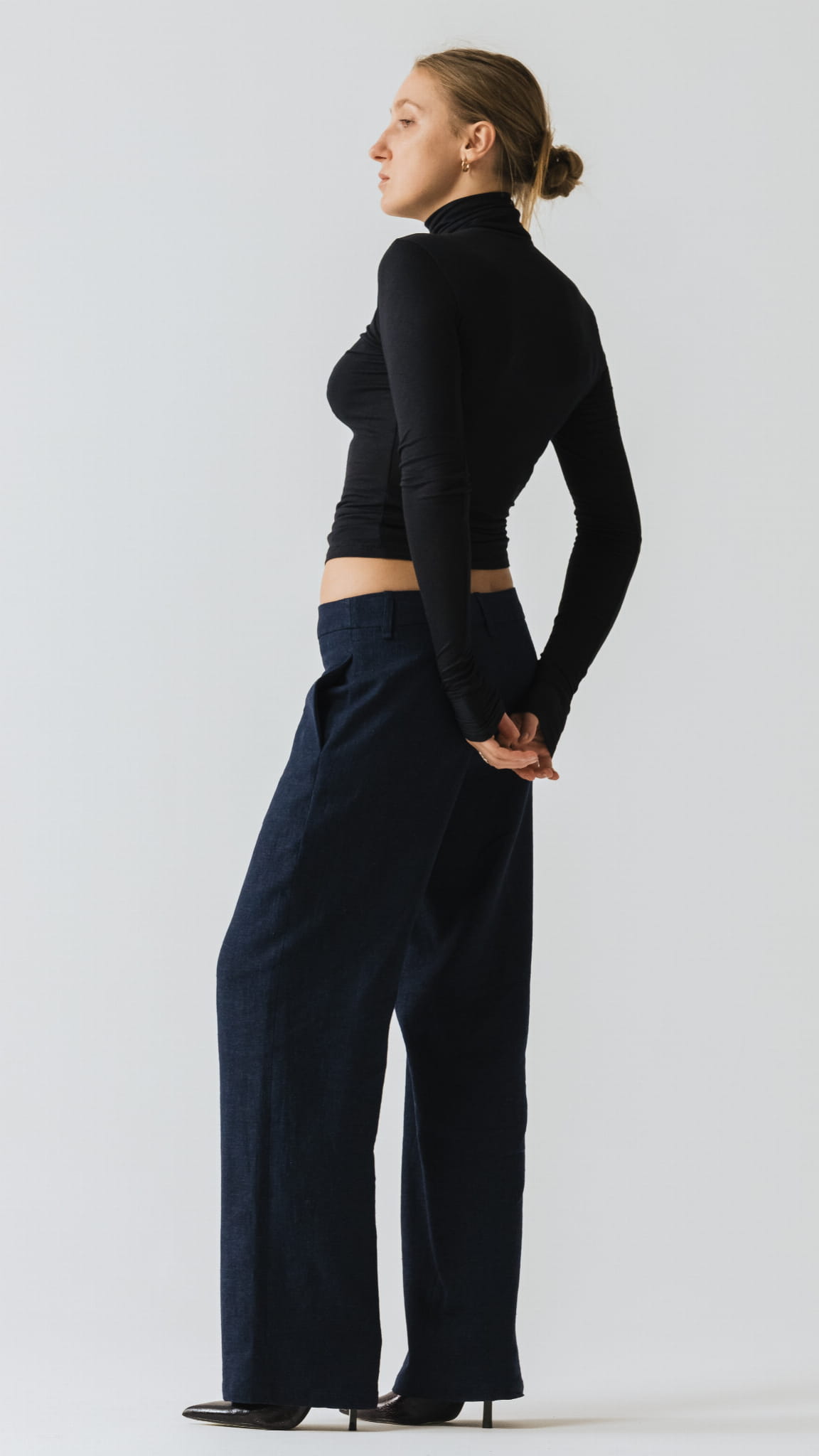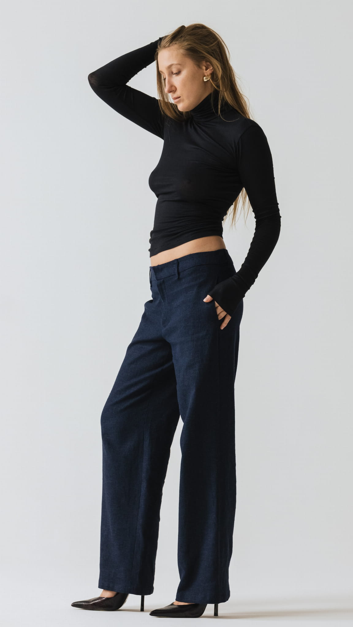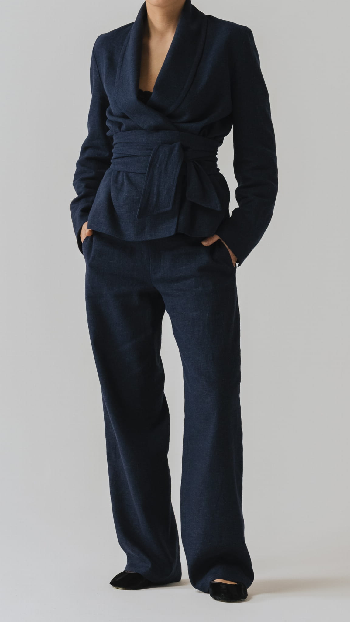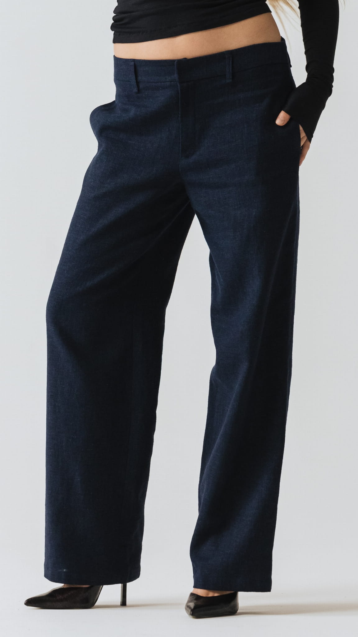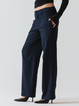 Granatowe spodnie z prosta nogawką o średnim stanie. Uszyte z mieszanki lniu i wiskozy, posiadają typowy dla lnu strukturalny wygląd tkaniny. Kieszenie po obu bokach ukryte w szwie. Pasek posada szlufki, a spodnie zapinane są na zamek i haftkę ukrytymi za zakładką.