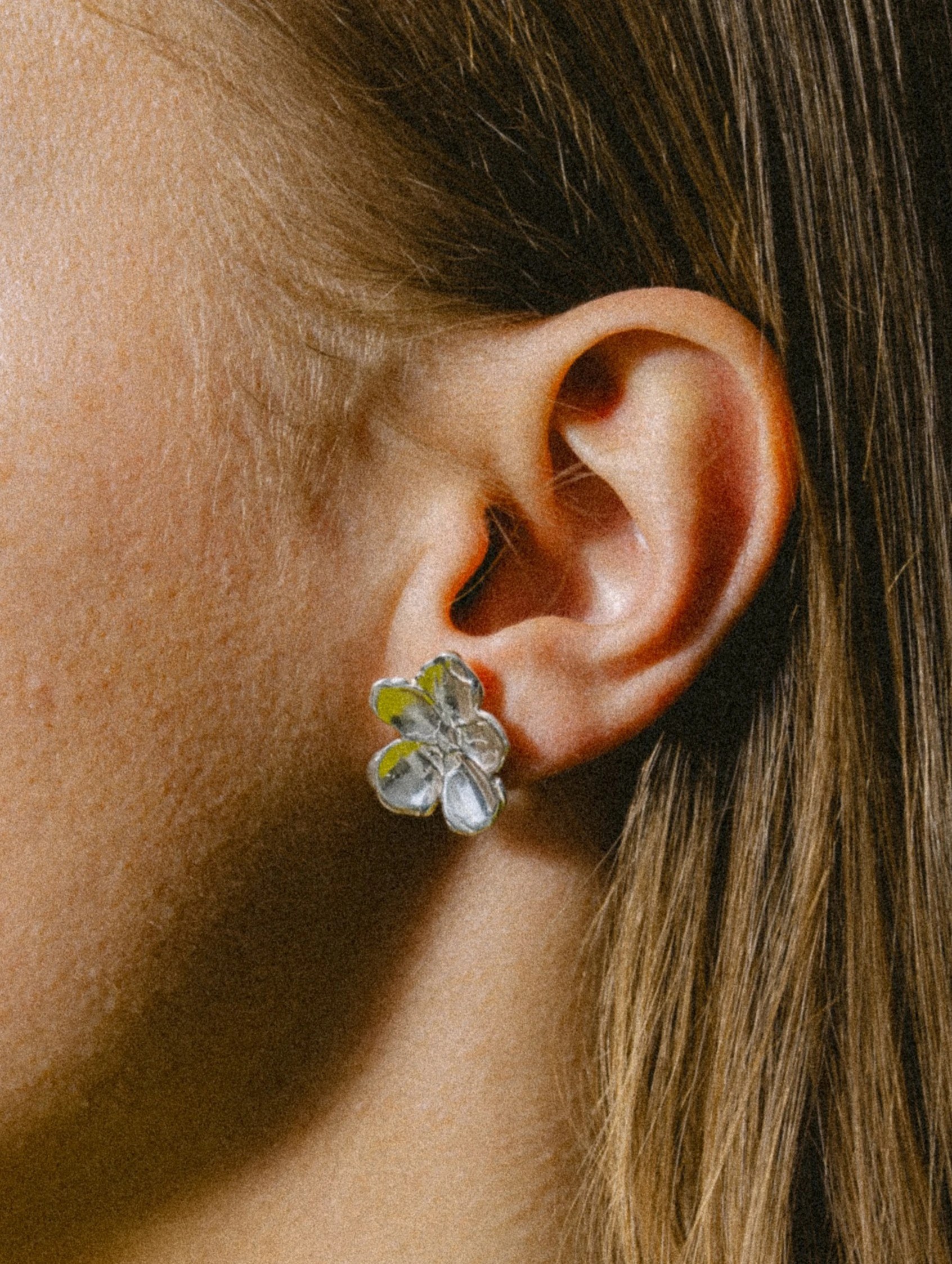 Kolczyk w formie pięciopłatkowego kwiatu, oparty na zwartej, delikatnie asymetrycznej kompozycji. Każdy z płatków buduje miękką, zaokrągloną linię, która układa się blisko ucha, tworząc spójną, kompaktową i zarazem lekką bryłę.