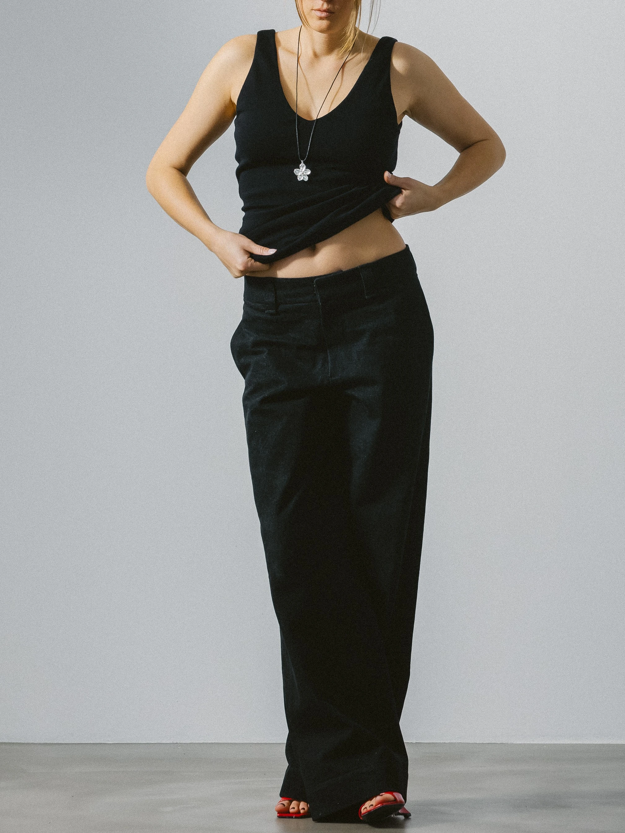 Zawieszka swobodnie układa się na ciele, zachowując swoją strukturę i proporcje. Całość oparta na relacji między symetrią a organiczną nieregularnością, z naciskiem na detal i ręczne opracowanie formy. Długość sznurka regulowana.