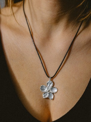 Zawieszka w formie pięciolistnego kwiatu, oparta na symetrycznym układzie i miękko modelowanej linii. Każdy z listków został ukształtowany indywidualnie, z lekką nieregularnością krawędzi, co nadaje całości organiczny, niemal rzeźbiarski charakter.