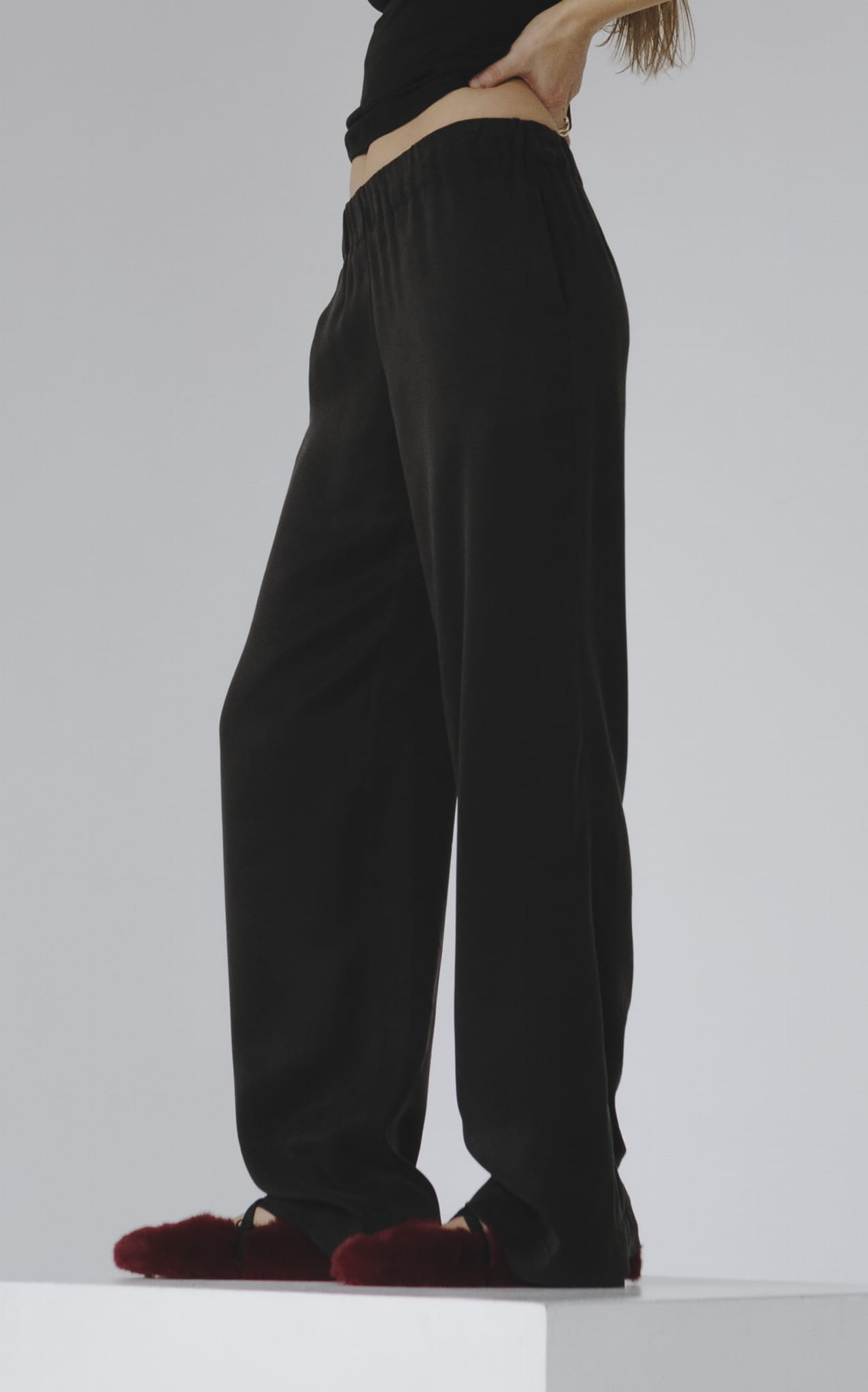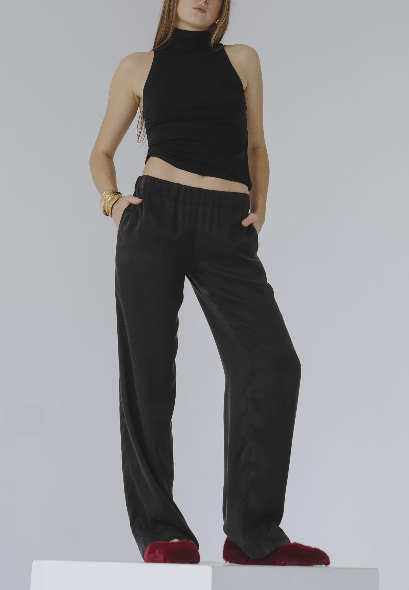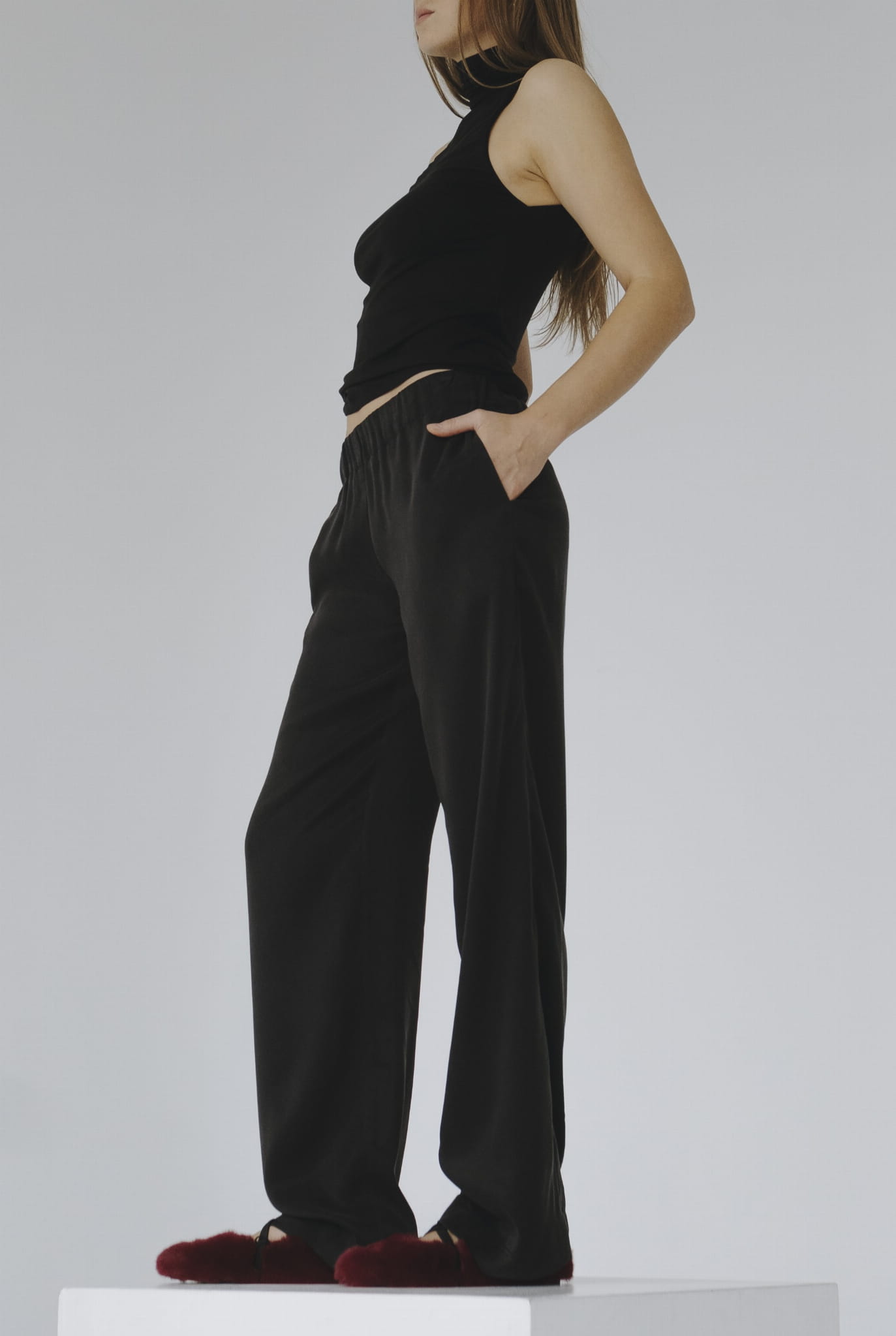 Czarne luźne spodnie, o prostej nogawce. Średni stan i gumka w pasie zapewniają komfort noszenia. Po bokach spodni w szwie ukryte są kieszenie.