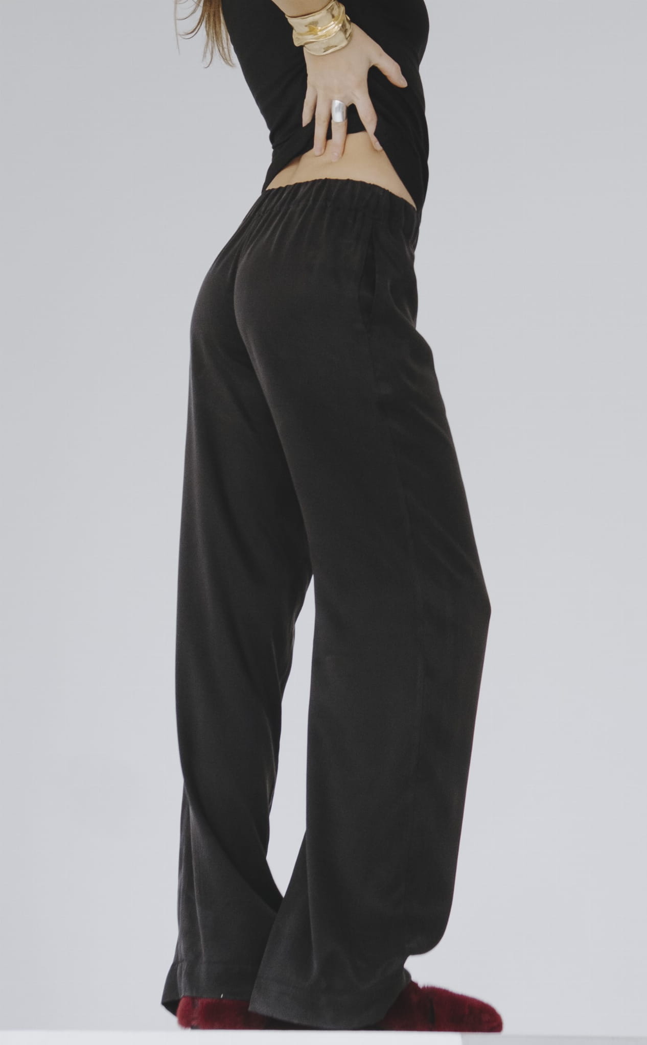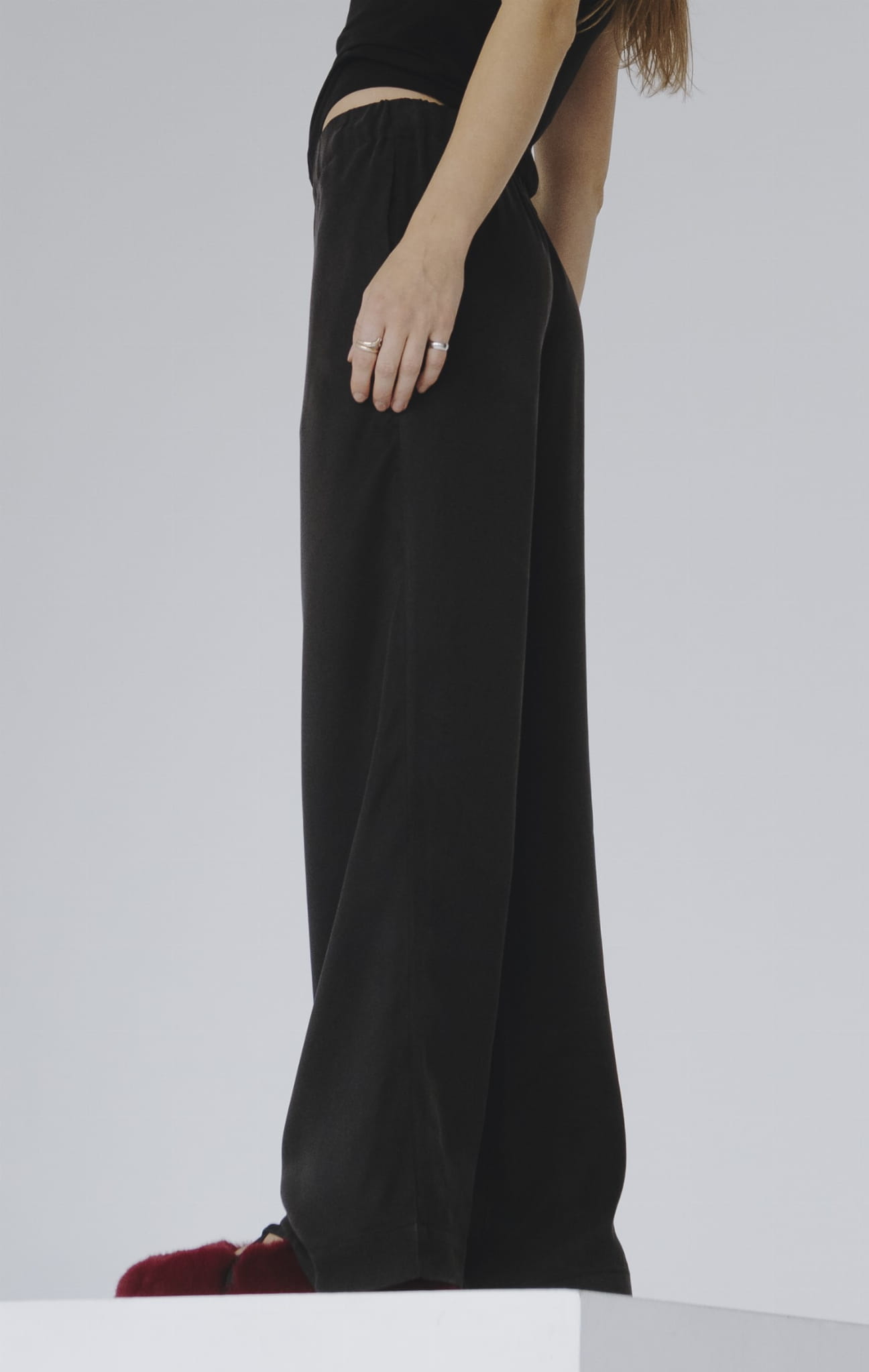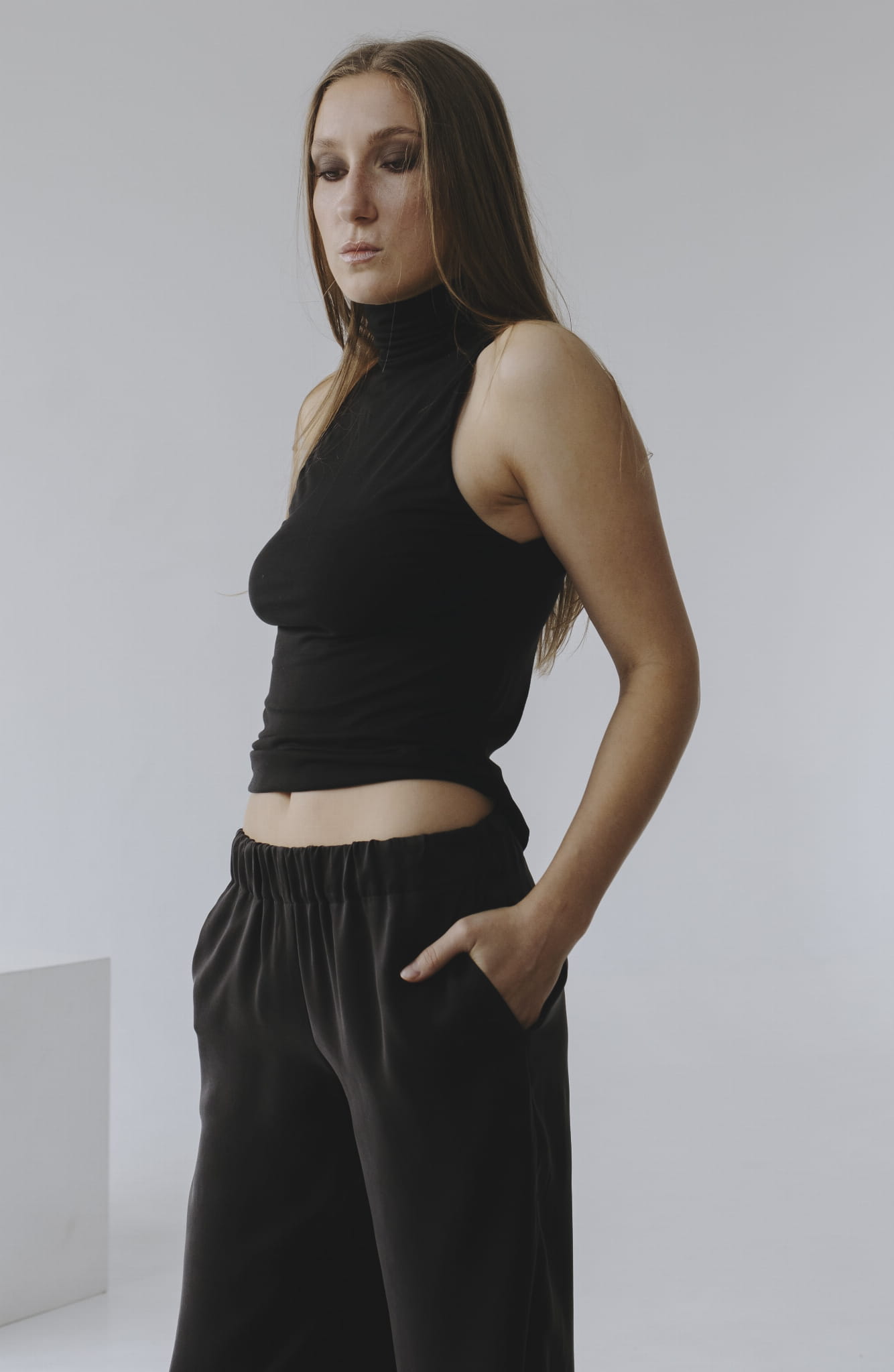Czarne luźne spodnie, o prostej nogawce. Średni stan i gumka w pasie zapewniają komfort noszenia. Po bokach spodni w szwie ukryte są kieszenie.