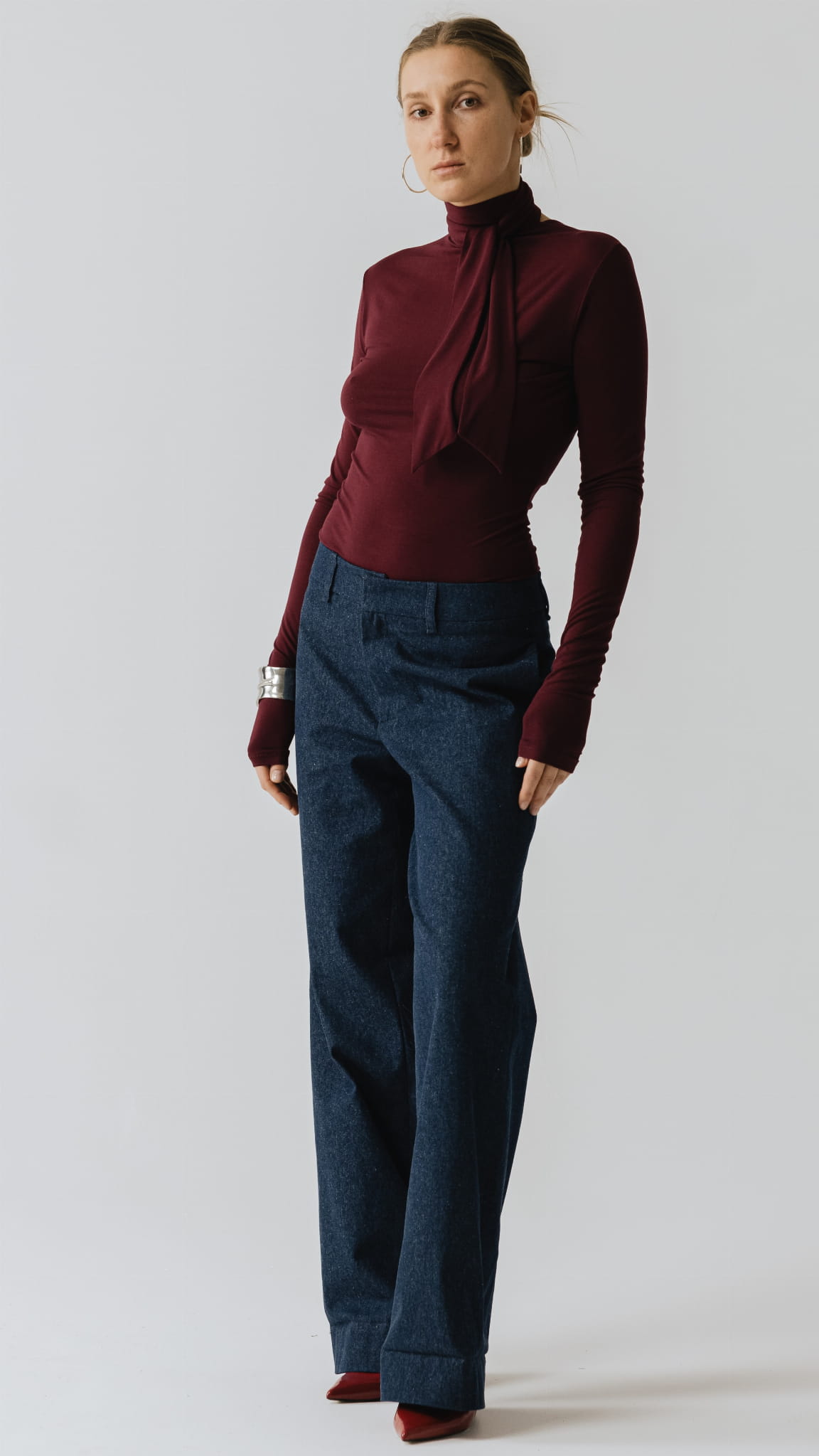 Dzianinowa bluzka z długim rękawem, dekoltem V i szarfa pod szyją. Przylegająca do ciała, elegancko eksponuję dekolt w literę V, w miejscu biustu posiada dodatkową warstwę dzianiny dla zachowania maksymalnego komfortu.