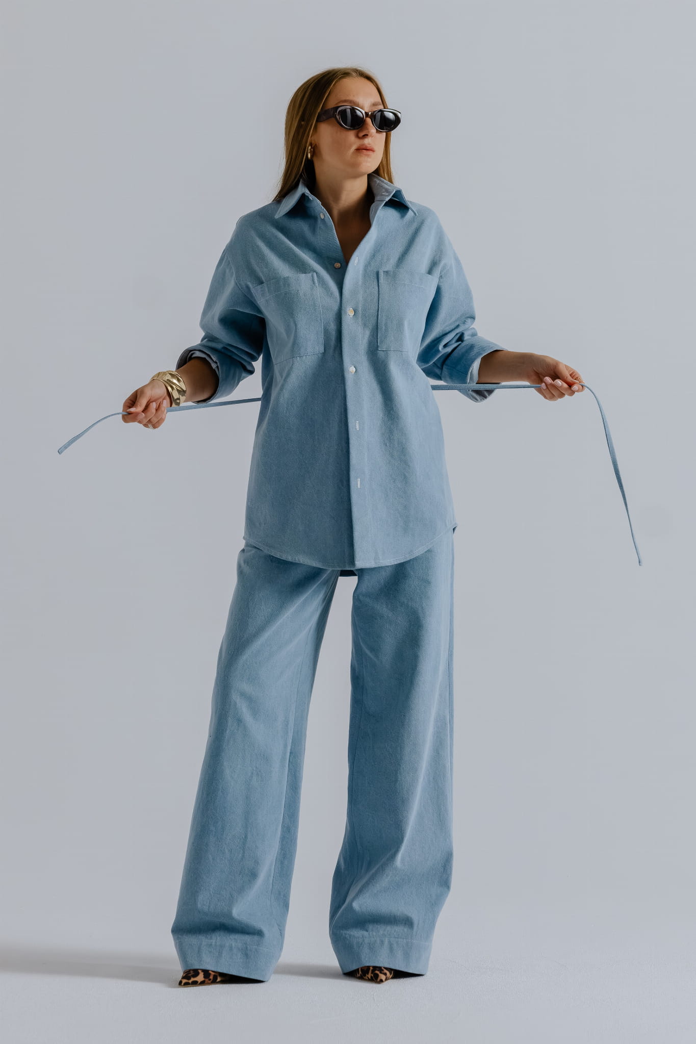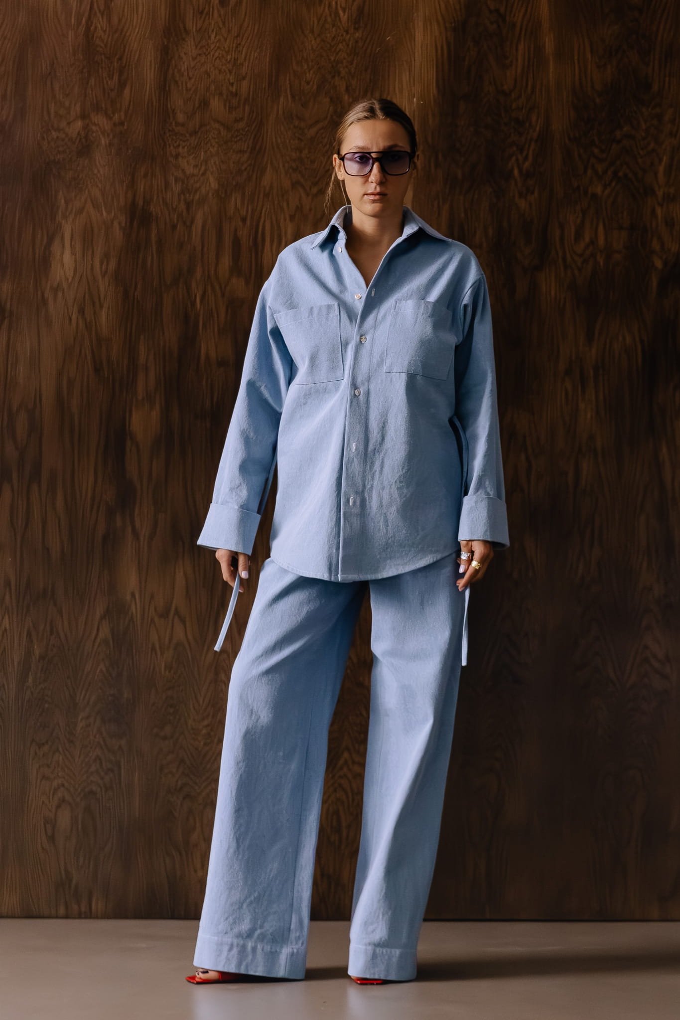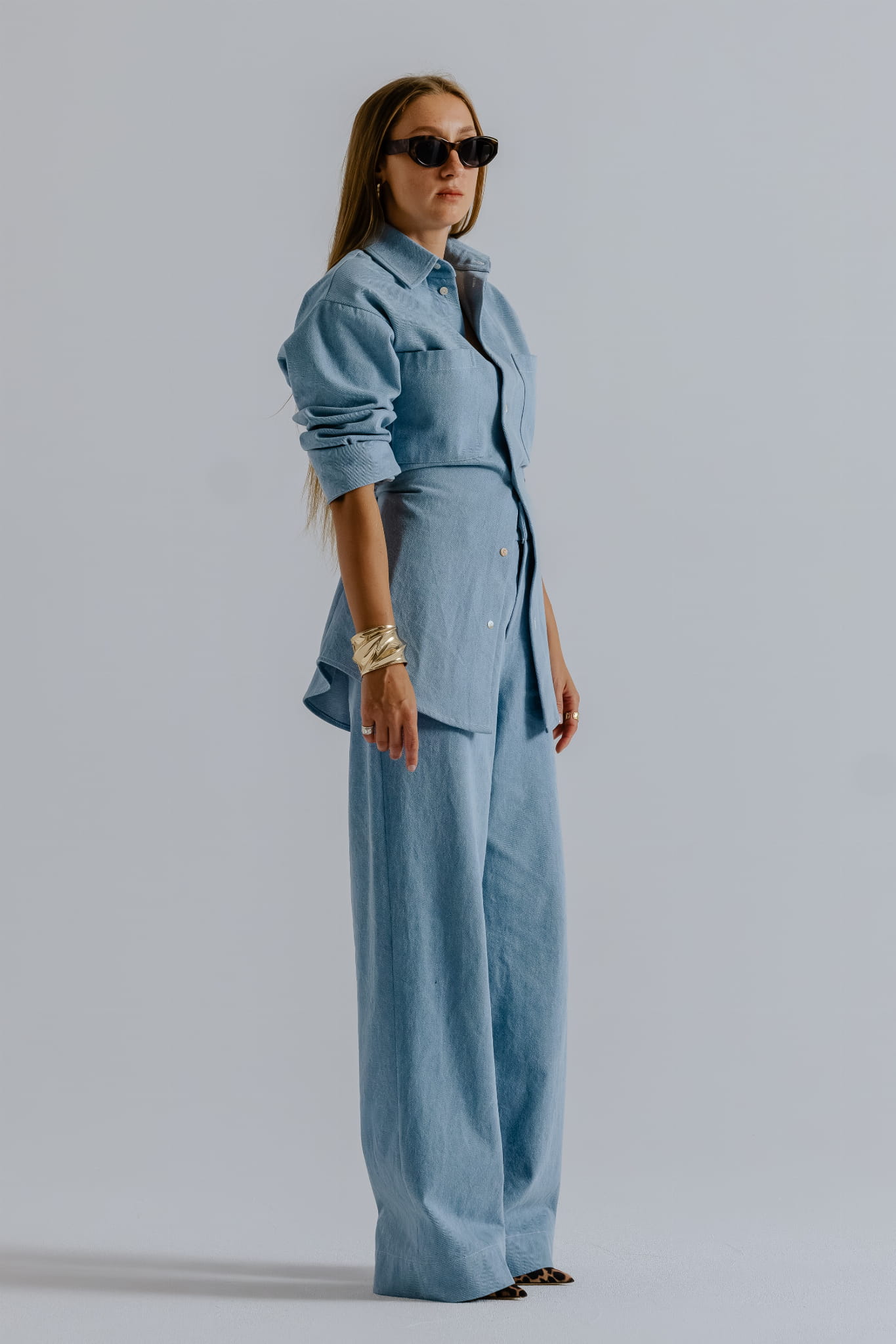 Spodnie z wysokim stanem, uszyte w 100% z błękitnego denimu, to autorska, współczesna interpretacja klasycznych jeansów. Pozbawione charakterystycznych, kontrastowych przeszyć, zyskują czystą, minimalistyczną formę – to spodnie z denimu, ale nie typowe jeansy. Mocna, gruba tkanina doskonale trzyma kształt i zapewnia ochronę w chłodniejsze dni, jednocześnie zachowując wygodę noszenia.
