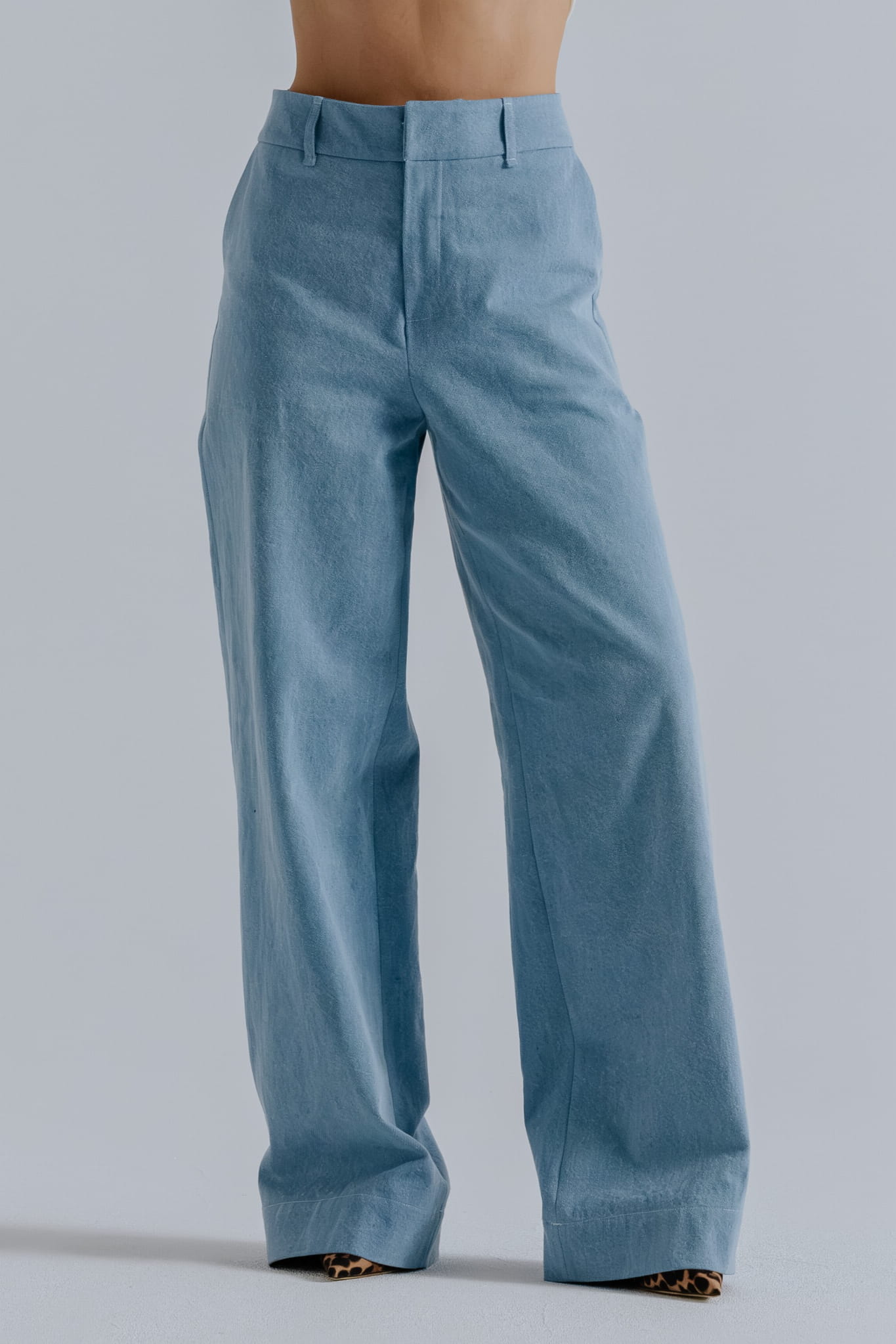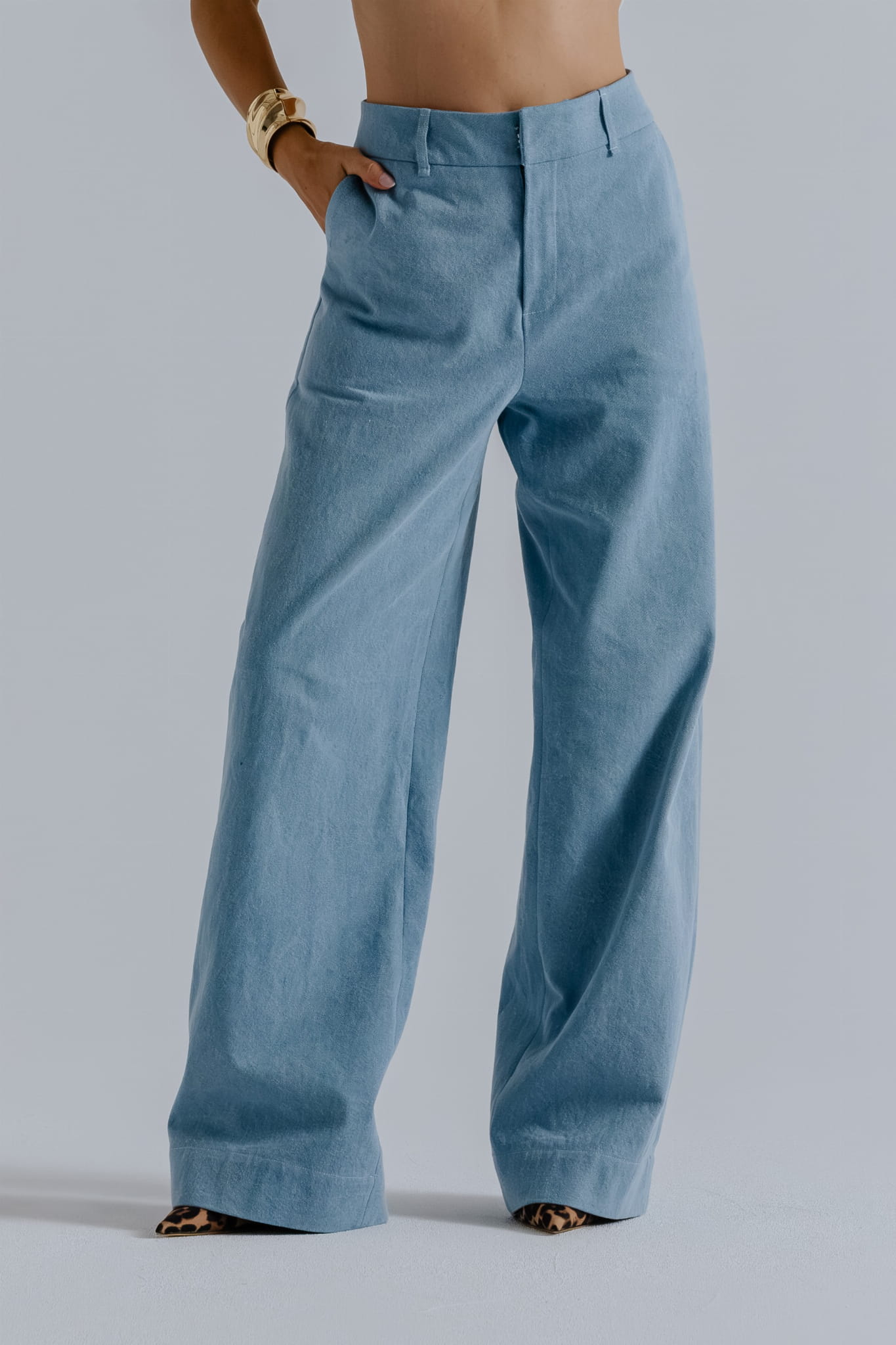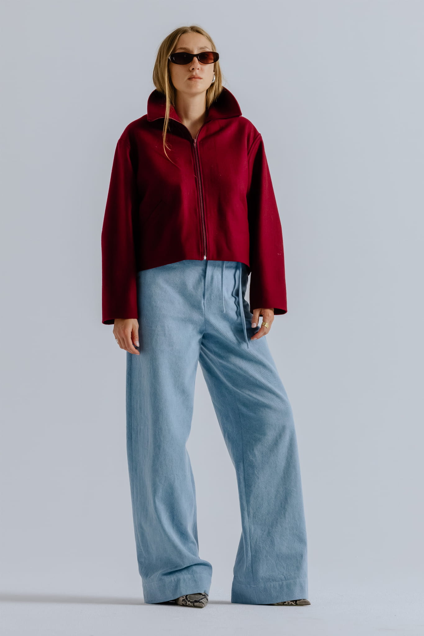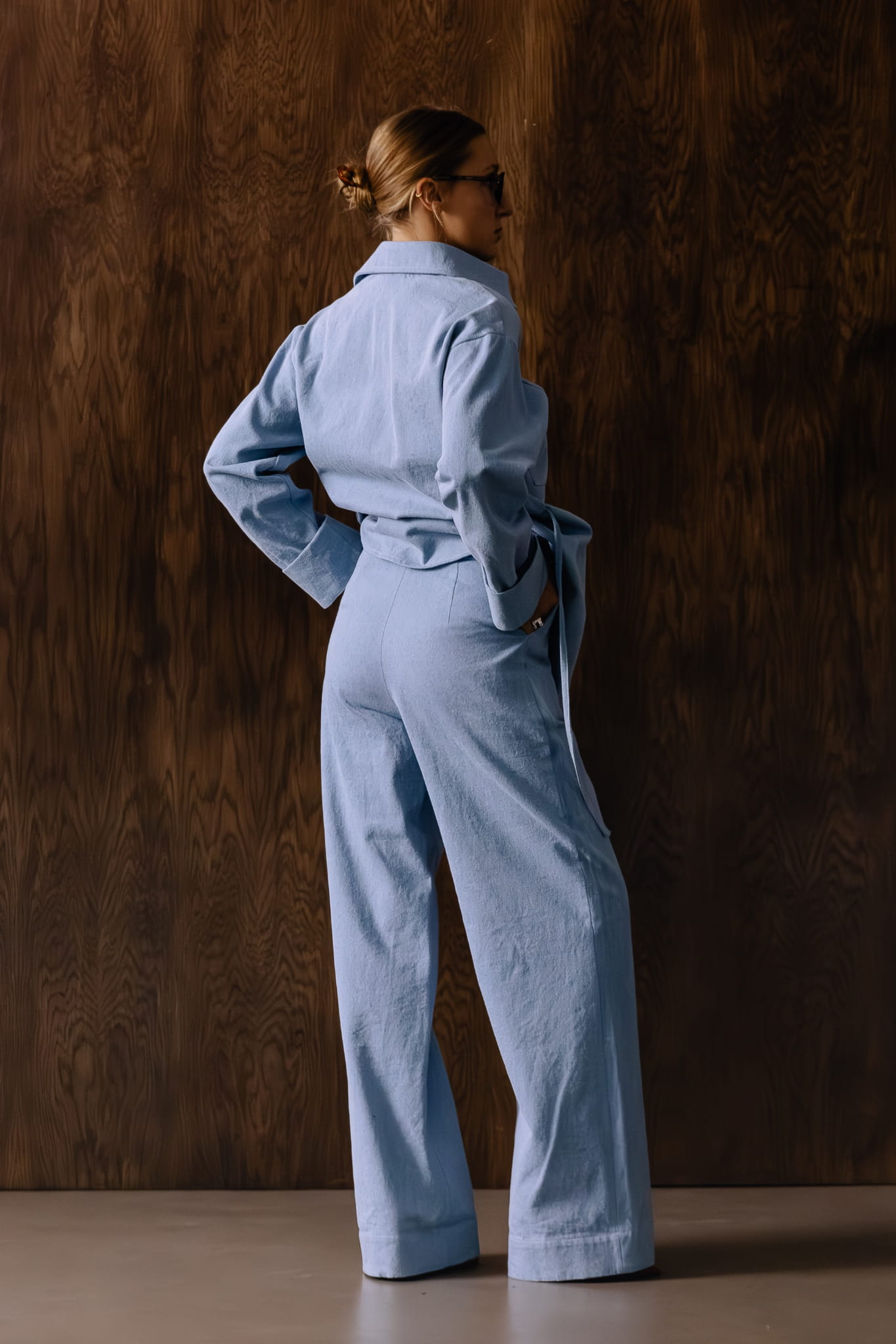 Spodnie z wysokim stanem, uszyte w 100% z błękitnego denimu, to autorska, współczesna interpretacja klasycznych jeansów. Pozbawione charakterystycznych, kontrastowych przeszyć, zyskują czystą, minimalistyczną formę – to spodnie z denimu, ale nie typowe jeansy. Mocna, gruba tkanina doskonale trzyma kształt i zapewnia ochronę w chłodniejsze dni, jednocześnie zachowując wygodę noszenia.