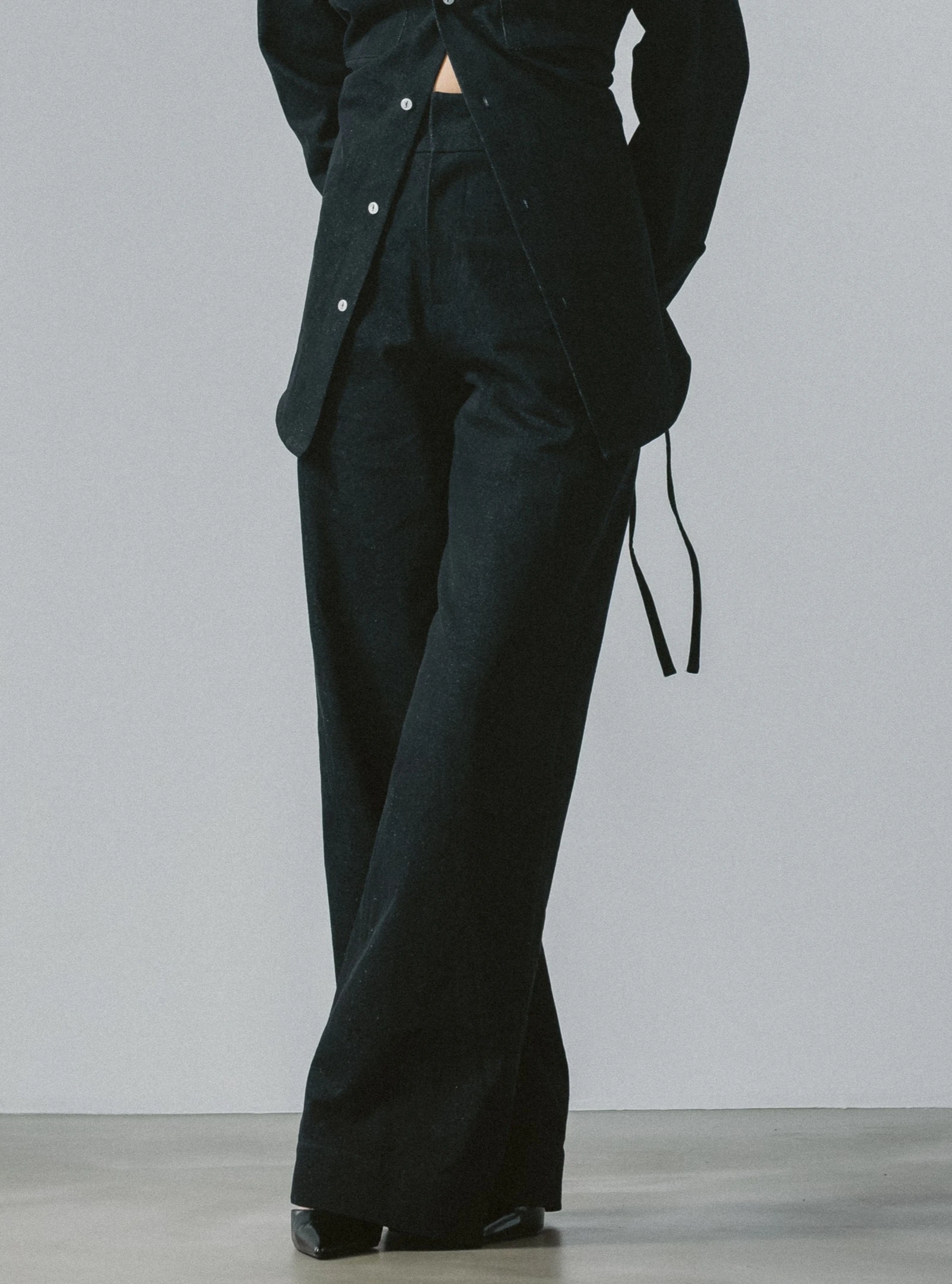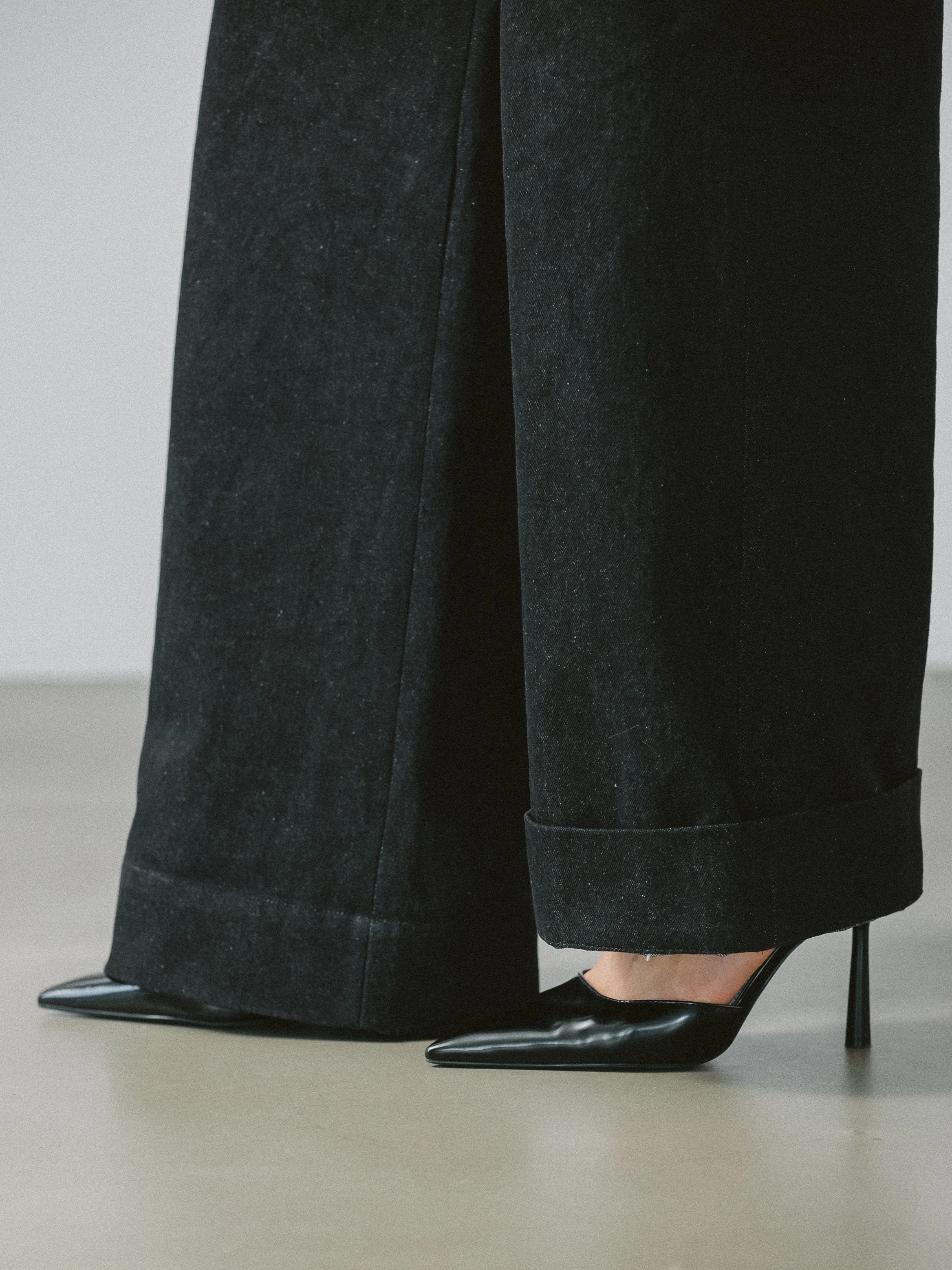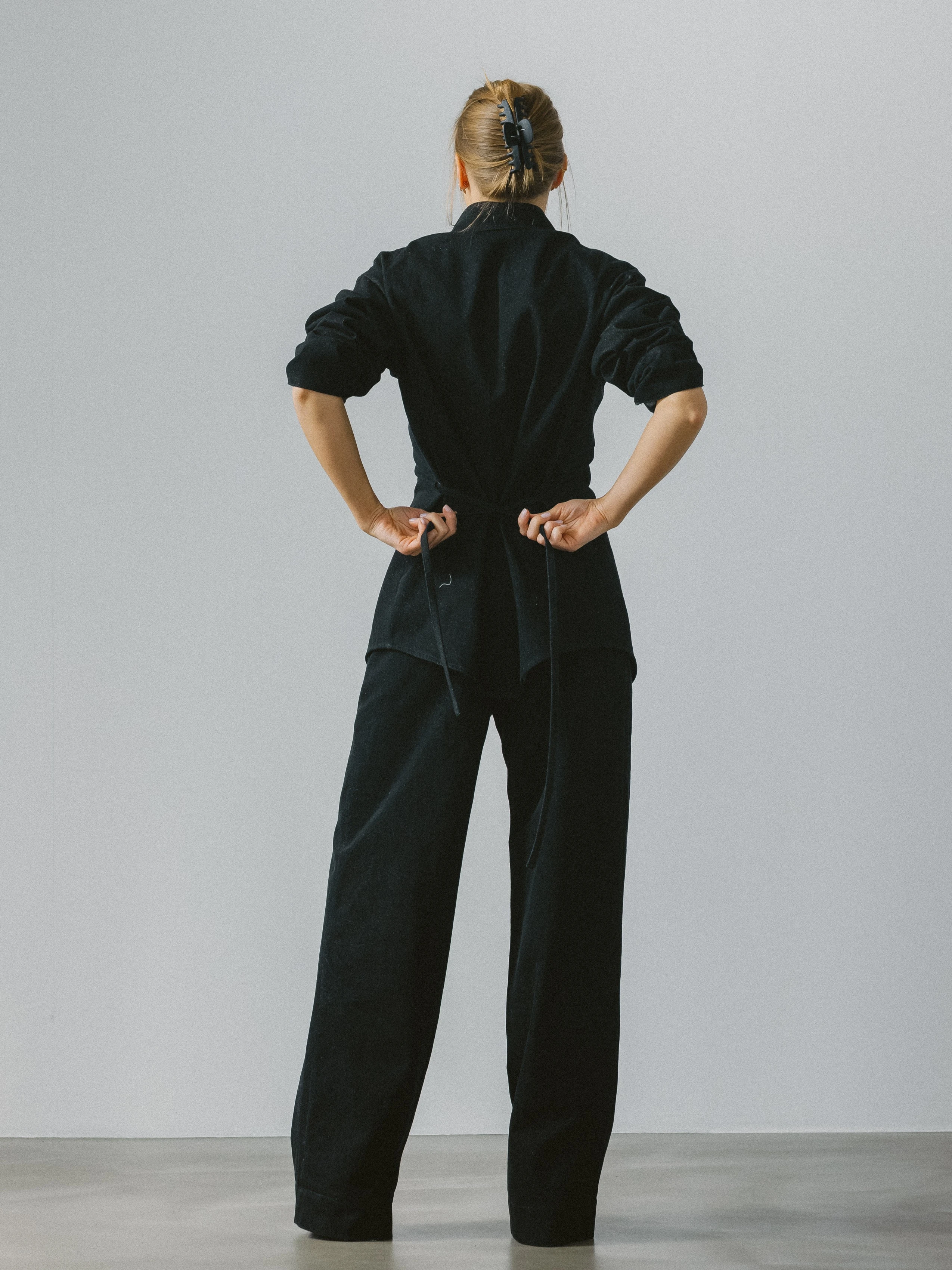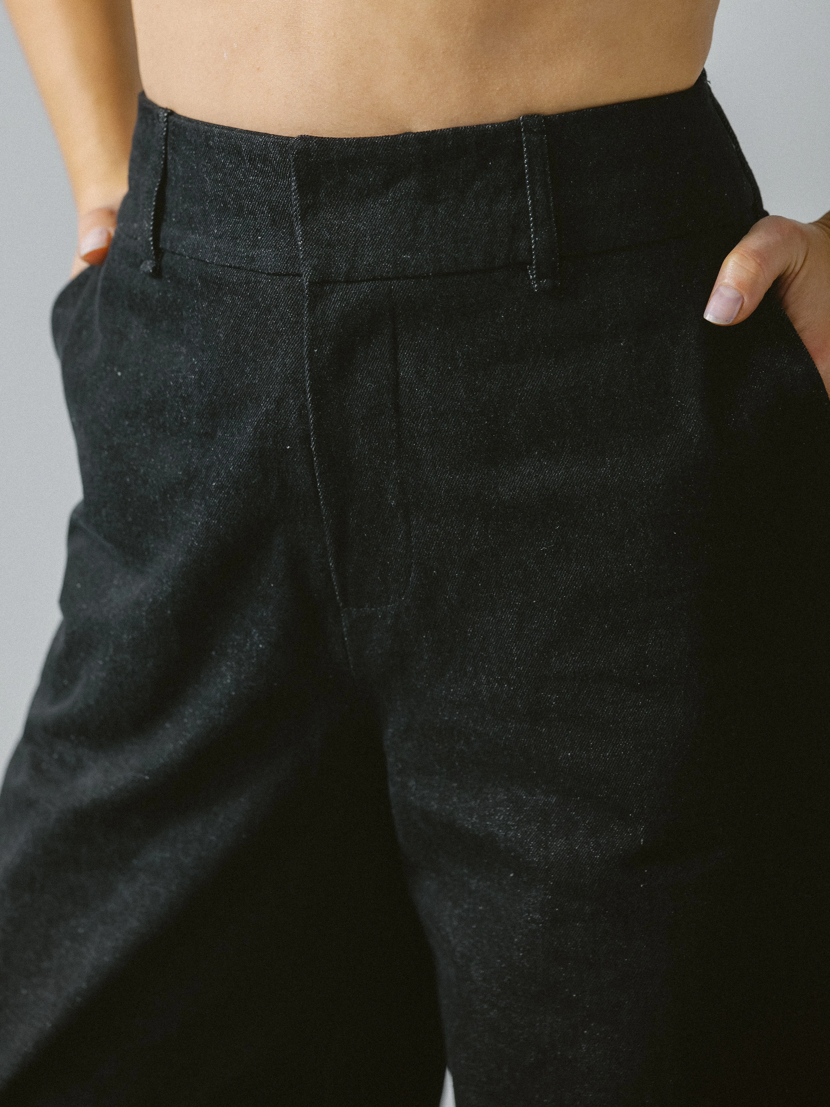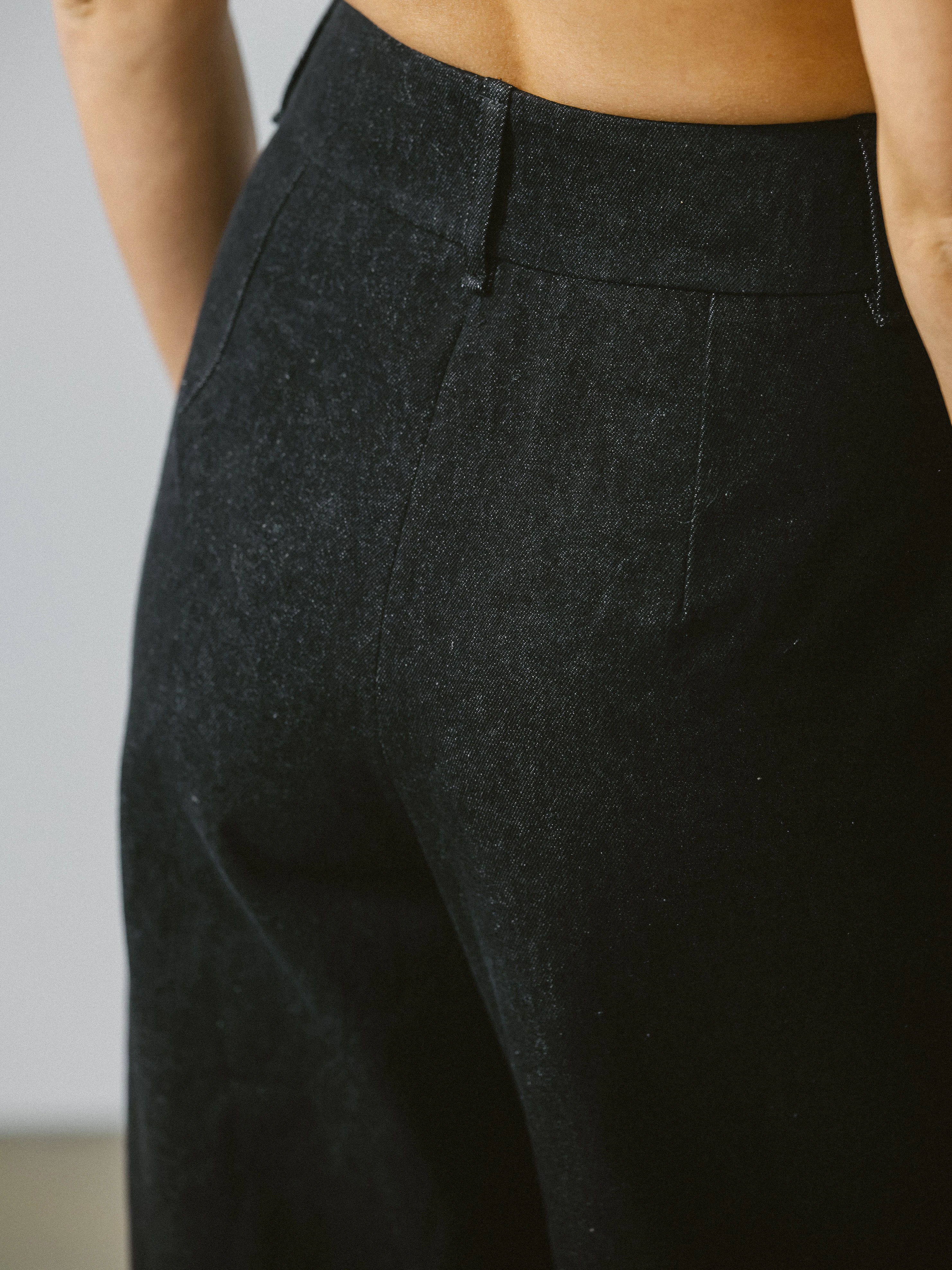 Spodnie z wysokim stanem, uszyte z 100% bawełny w kolorze antracytu, to autorska, współczesna interpretacja klasycznych jeansów. Pozbawione charakterystycznych, kontrastowych przeszyć, zyskują czystą, minimalistyczną formę – to spodnie z denimu, ale nie typowe jeansy. Mocna, gruba tkanina doskonale trzyma kształt i zapewnia ochronę w chłodniejsze dni, jednocześnie zachowując wygodę noszenia.