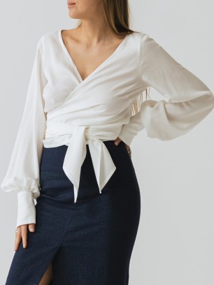 Kopertowa koszula z długim rękawem oraz wiązaniem w kolorze złamanej bieli. Długie, rozszerzające ku dołowi rękawy, wykończone wysokim mankietem zapinanym przy pomocy oblekanych guzików.