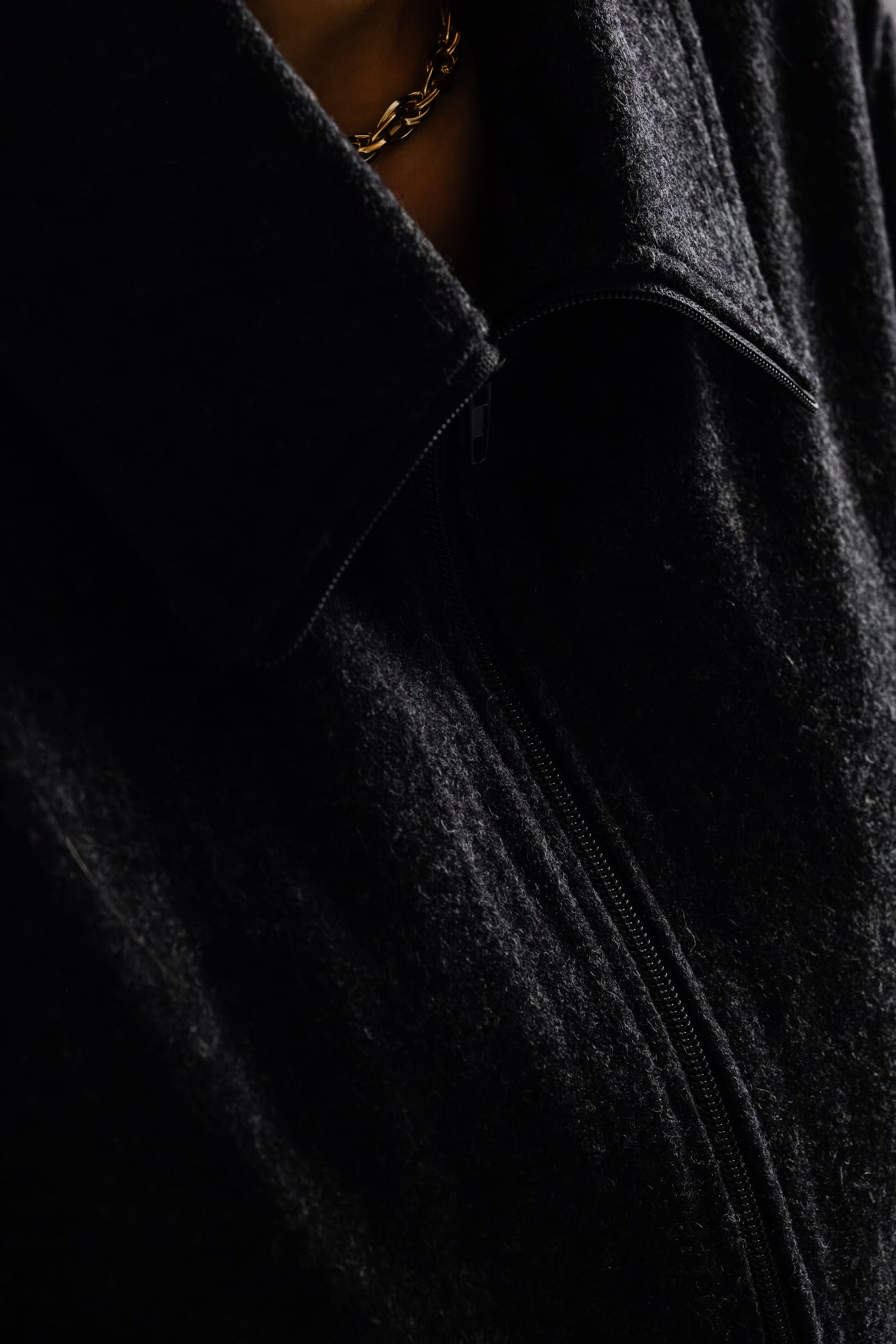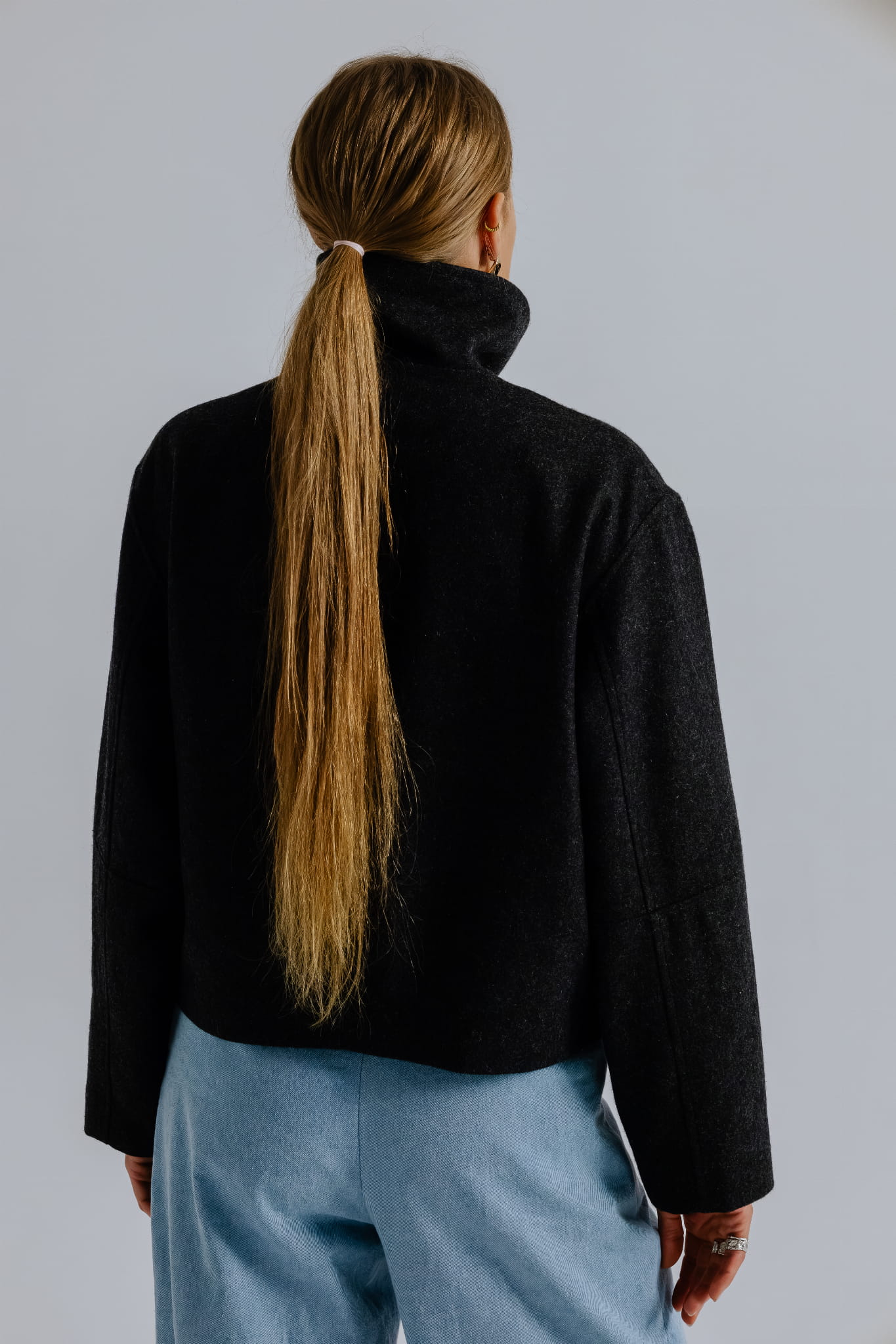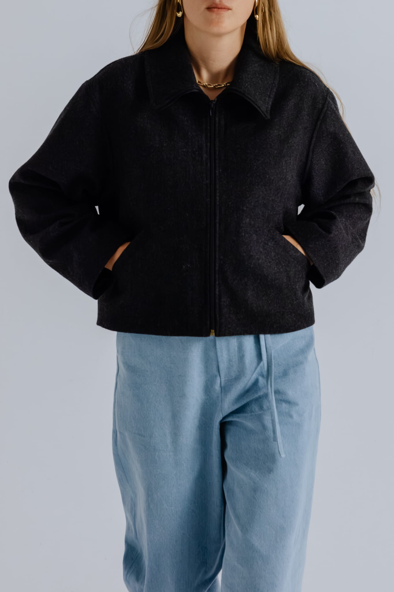Krótka kurtka o pudełkowym, oversizowym kroju, wykonana z wysokiej jakości mieszanki wełny i wiskozy w ciemno szarym kolorze, wpadający w antracyt z nutką melanżu. Wyposażona w zamek błyskawiczny z wysoką stójką, która po rozpięciu zmienia się w miękko układający się, obszerny kołnierz.