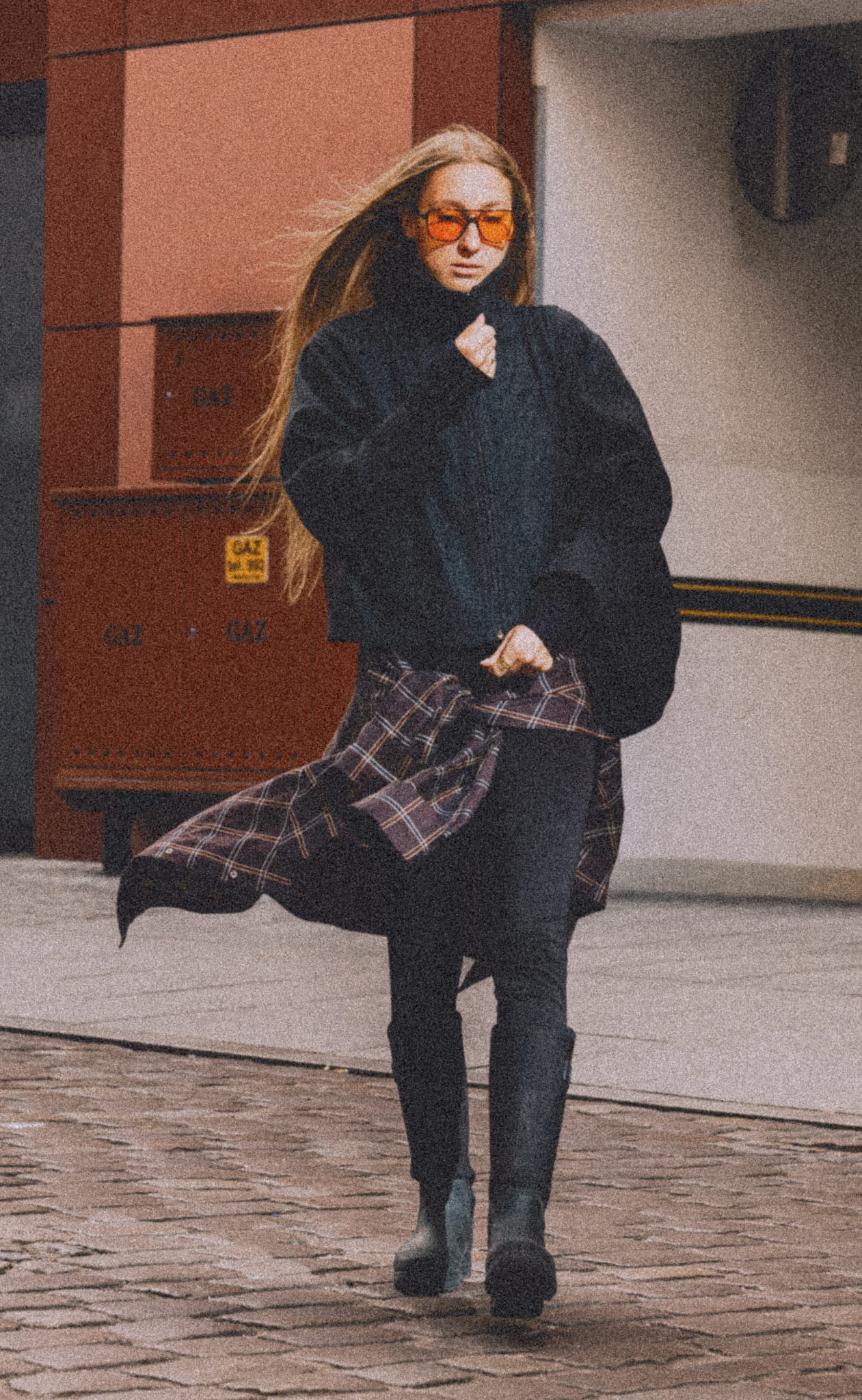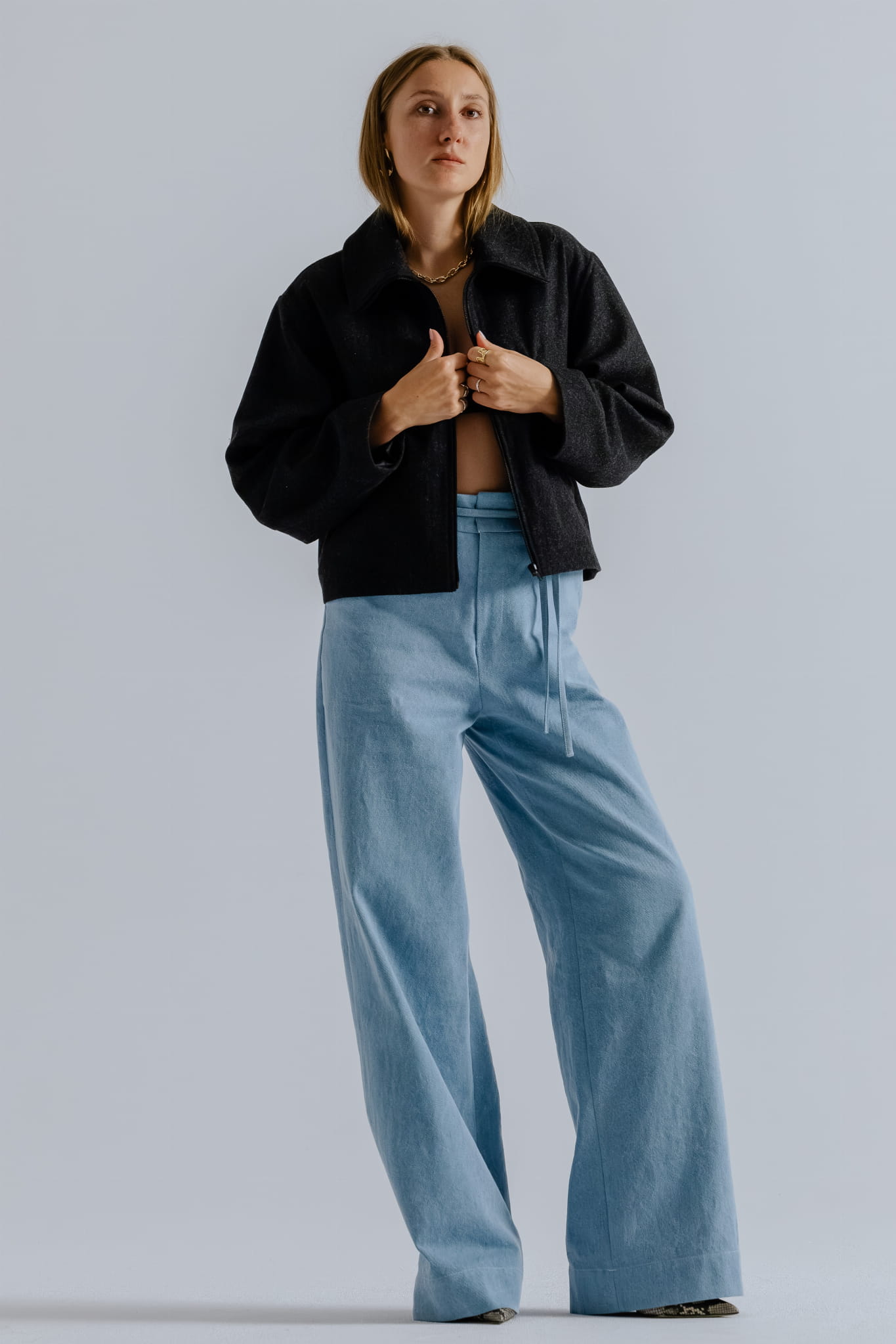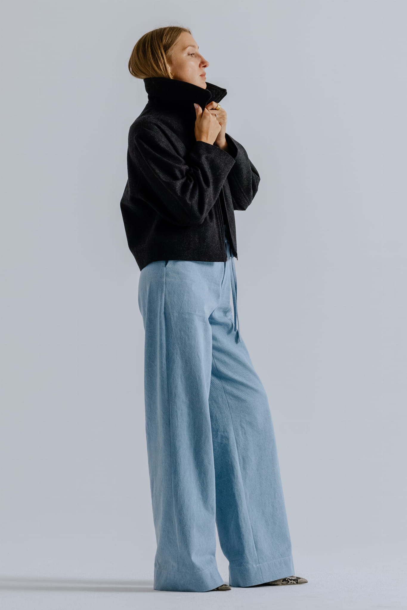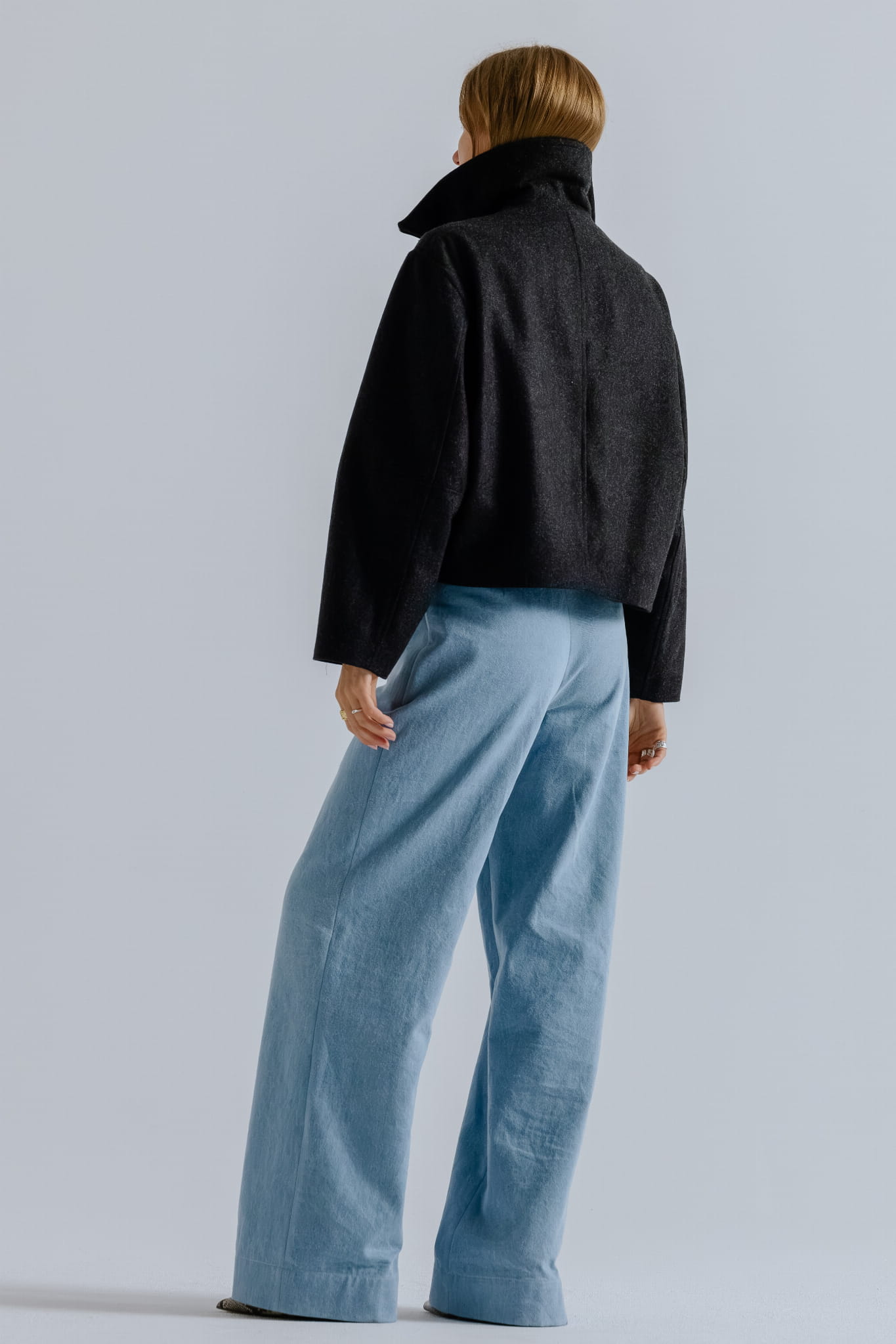Krótka kurtka o pudełkowym, oversizowym kroju, wykonana z wysokiej jakości mieszanki wełny i wiskozy w ciemno szarym kolorze, wpadający w antracyt z nutką melanżu. Wyposażona w zamek błyskawiczny z wysoką stójką, która po rozpięciu zmienia się w miękko układający się, obszerny kołnierz.
