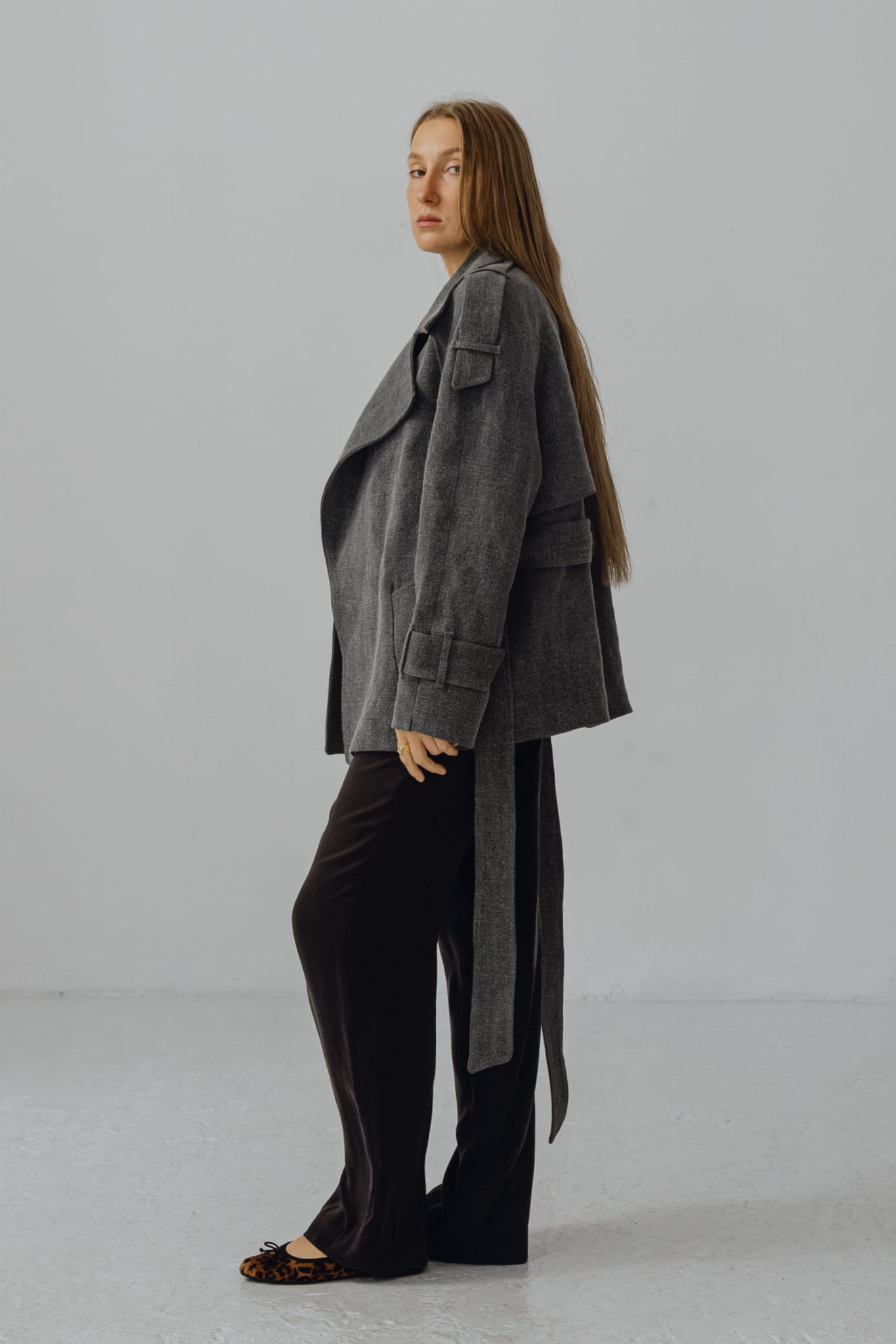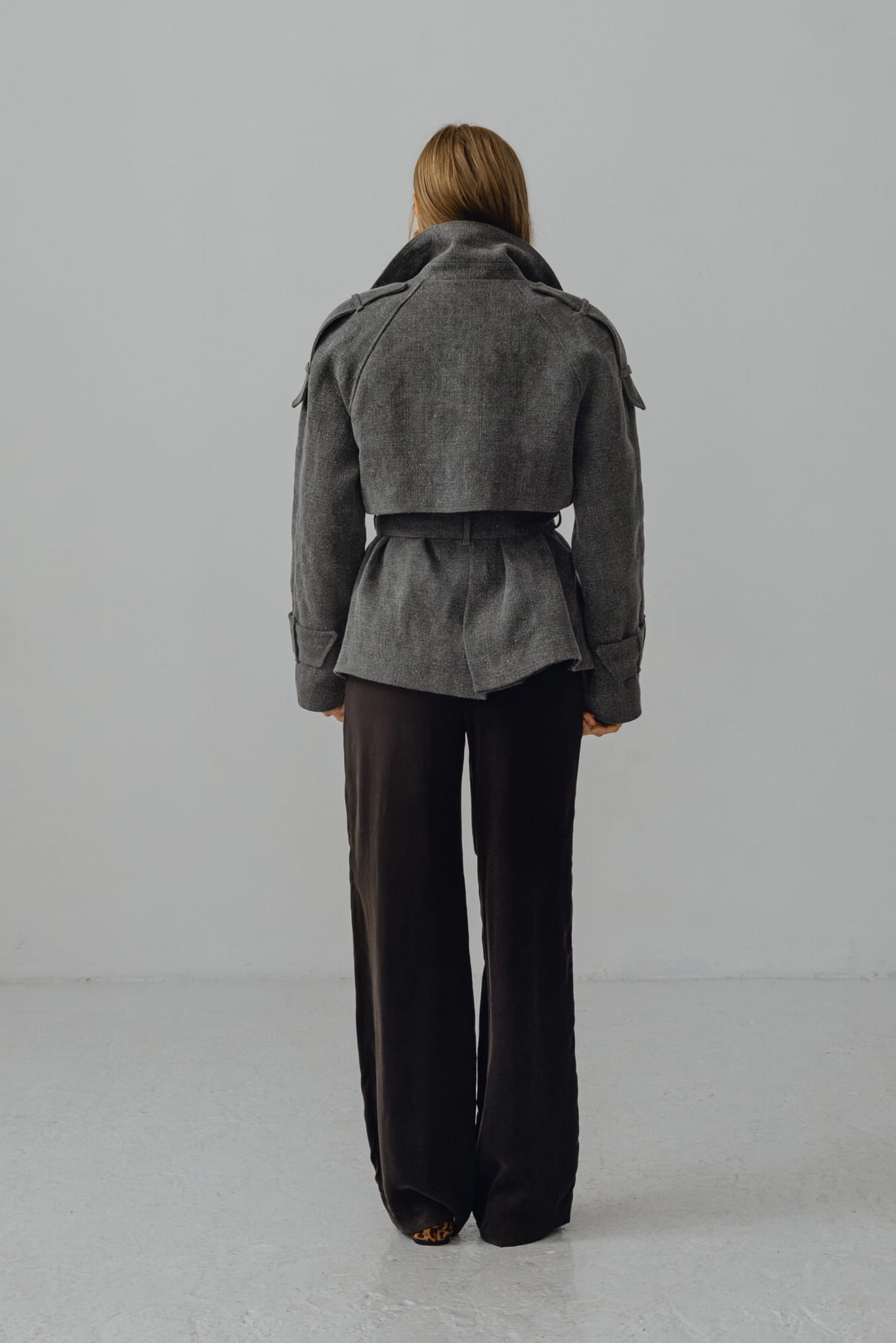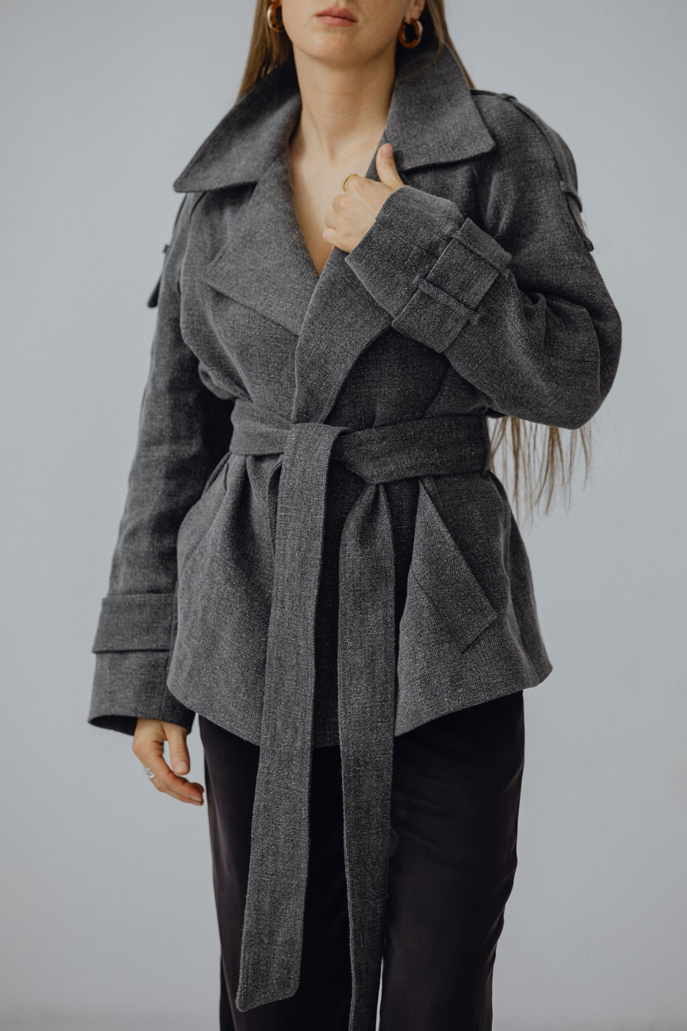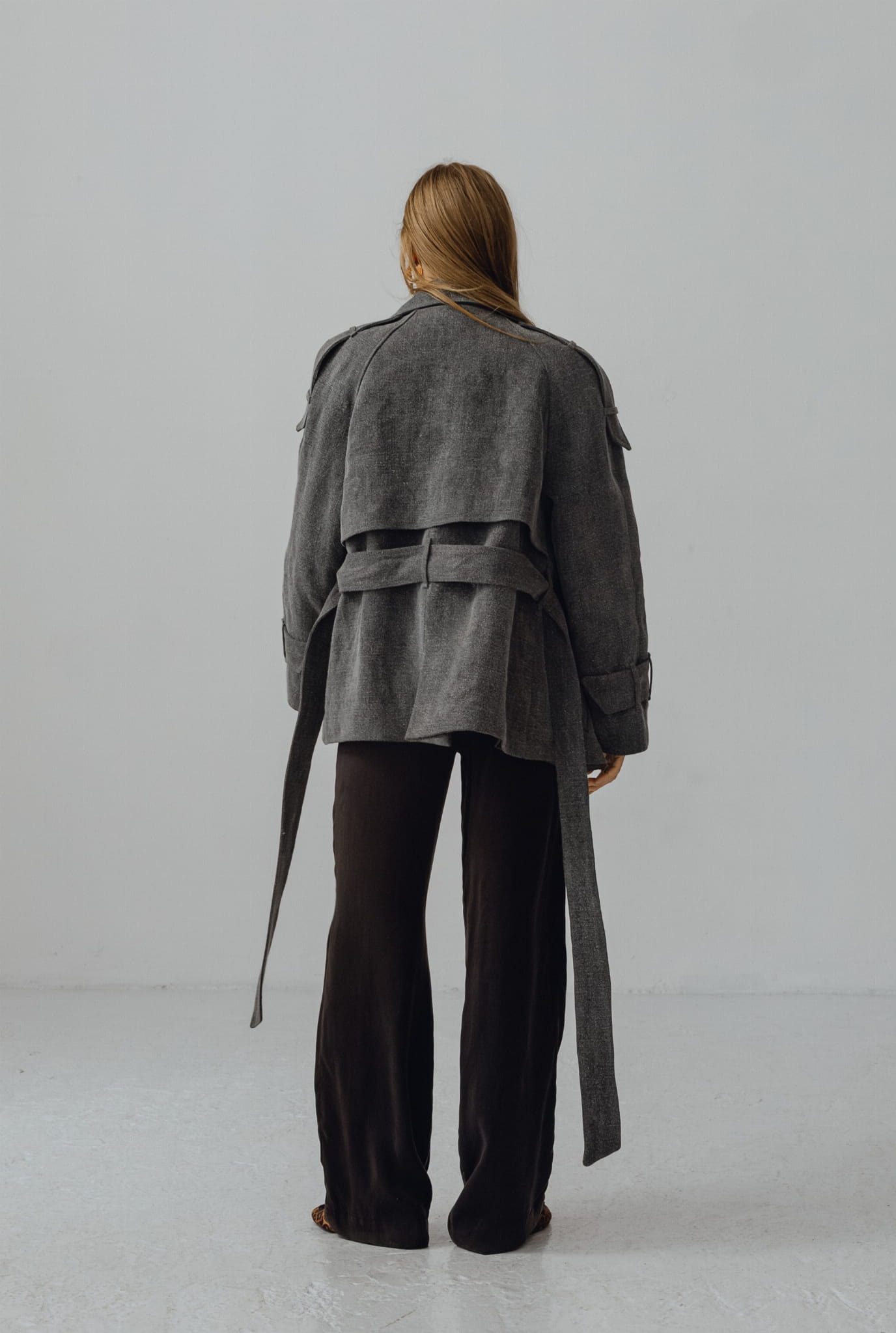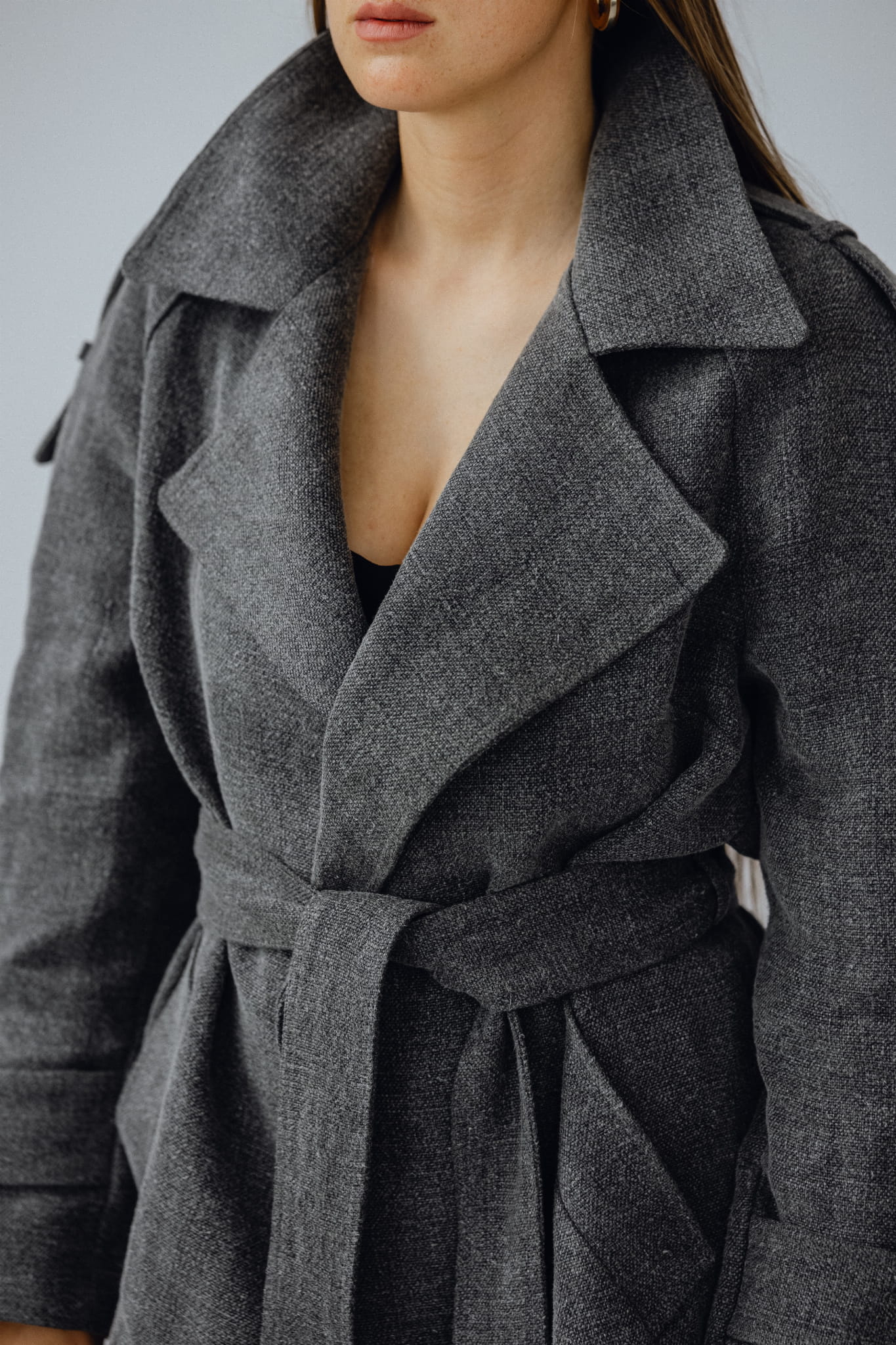 Krótki trencz uszyty z mięsistego 100% lnu o ciemnym grafitowym odcieniu. Lekko oversizowy, zamykany długim paskiem nadaje mocną formę twojej stylizacji. Reglanowy rękaw sam dopasuje się do twoich ramion przesadnie ich nie poszerzając.