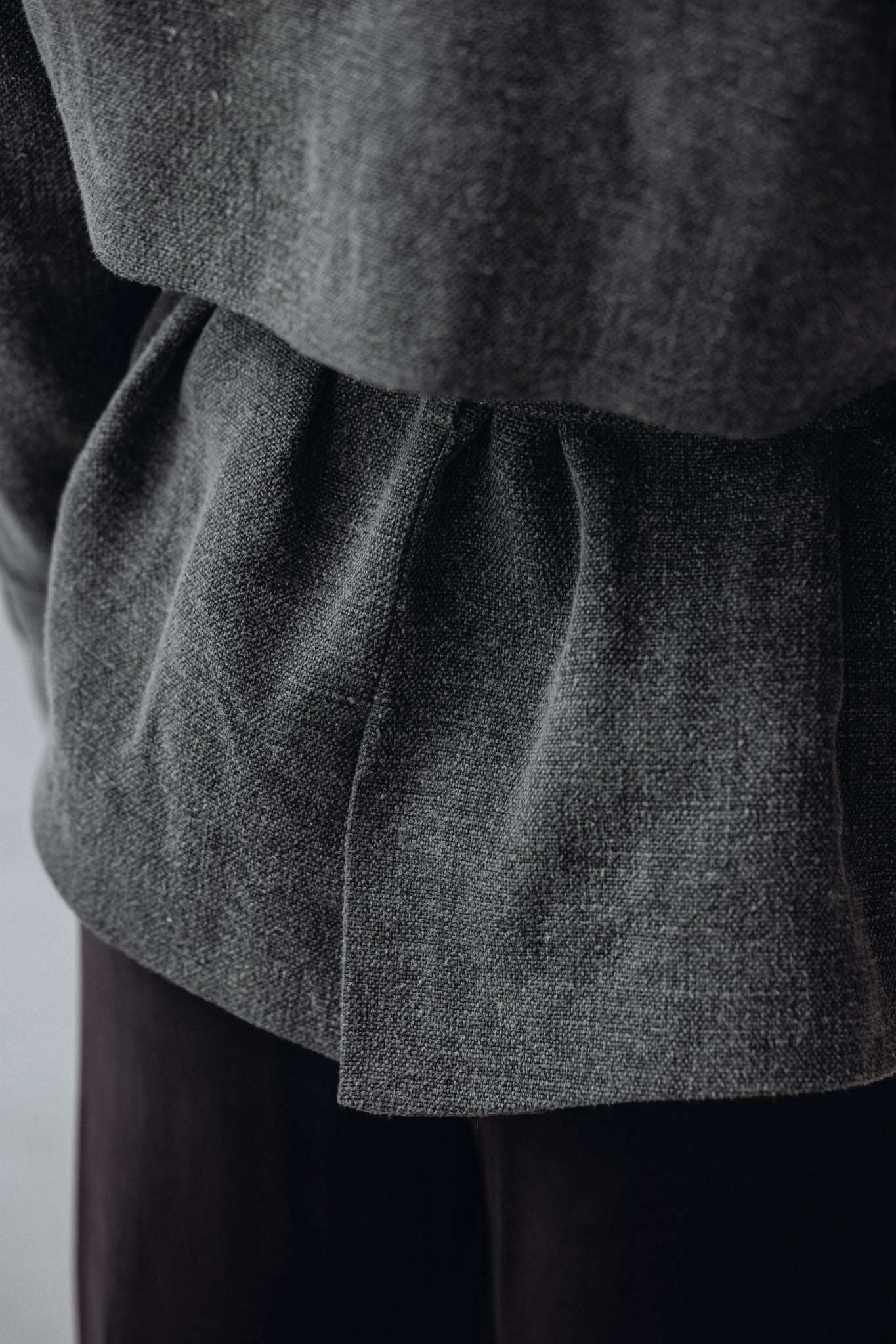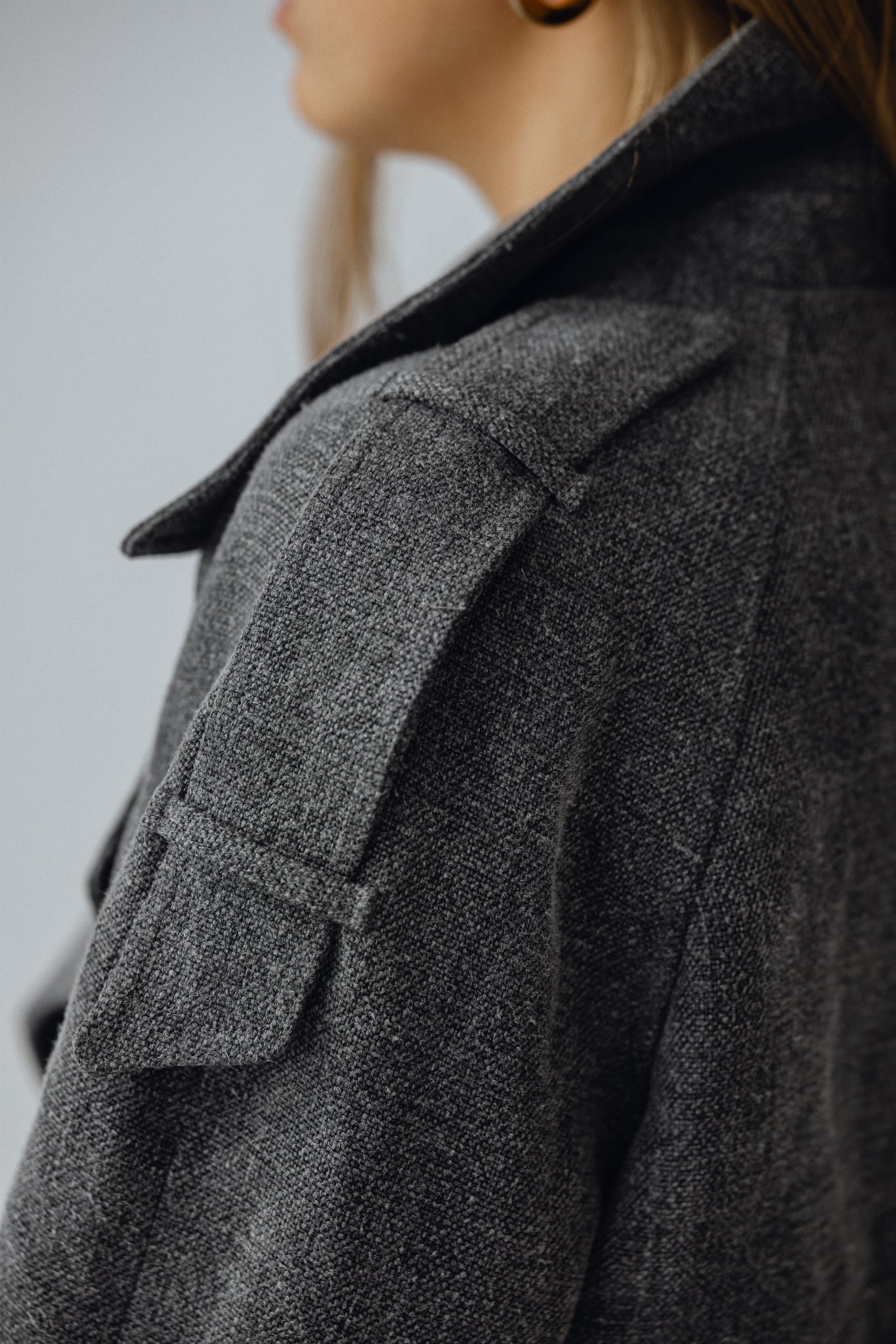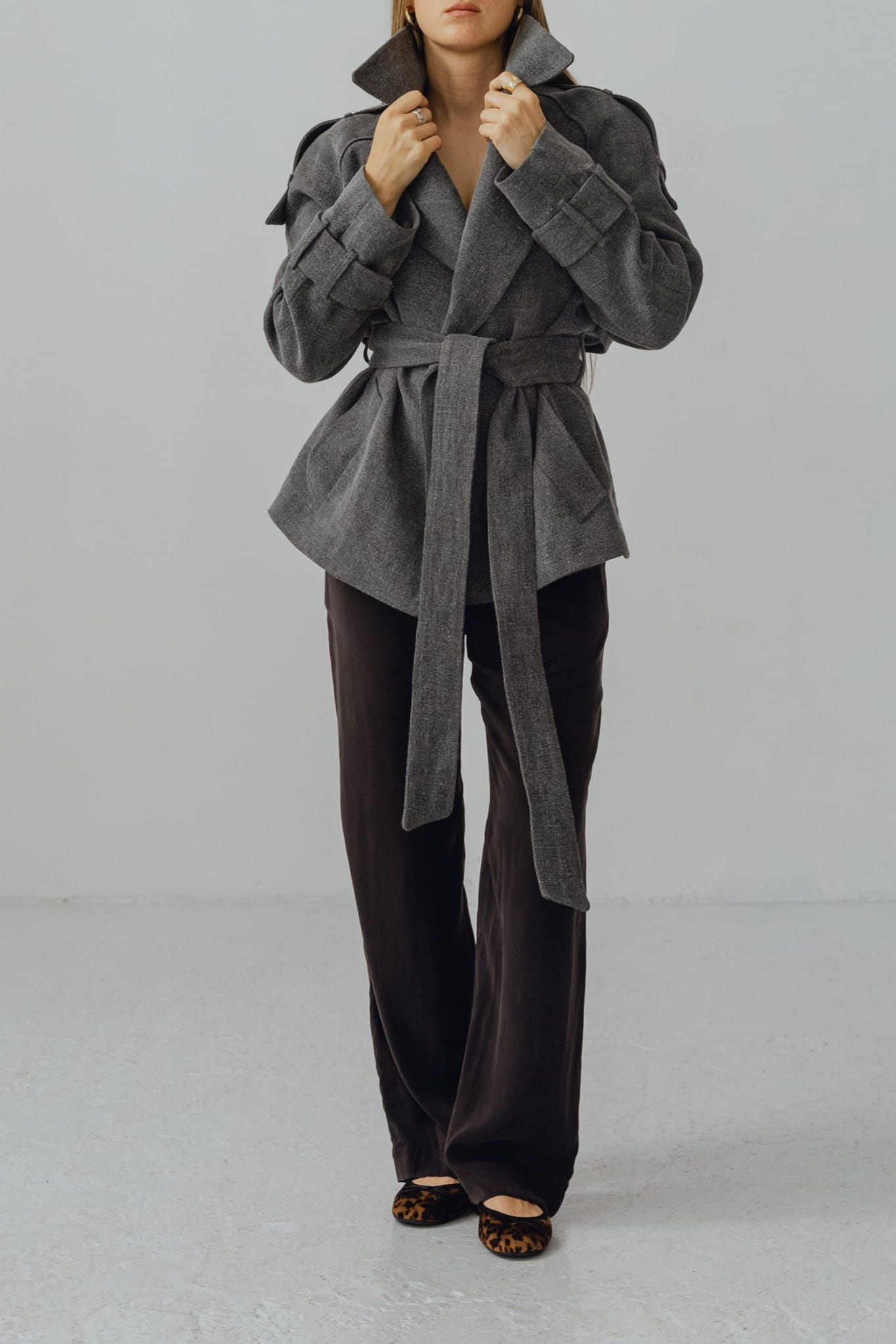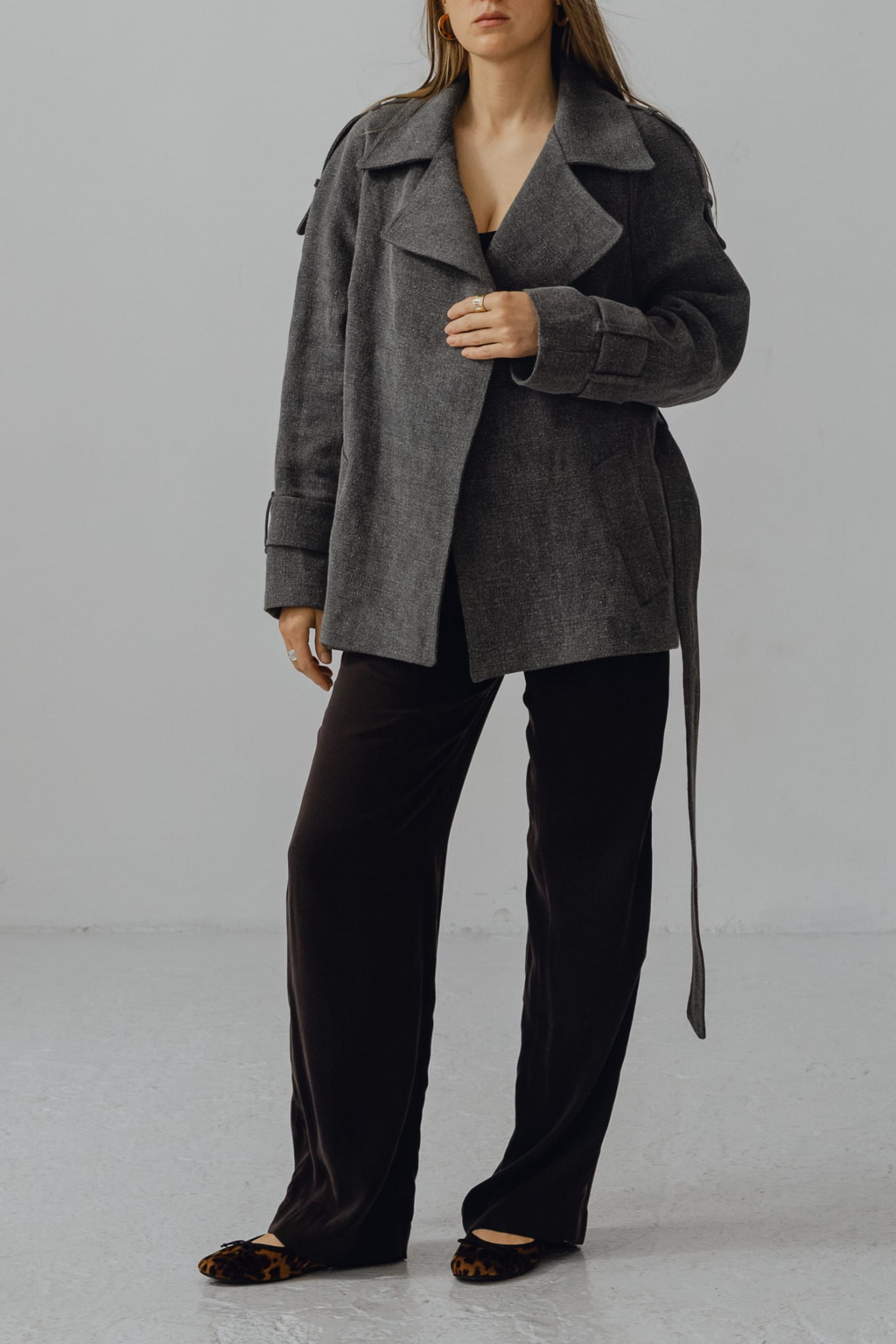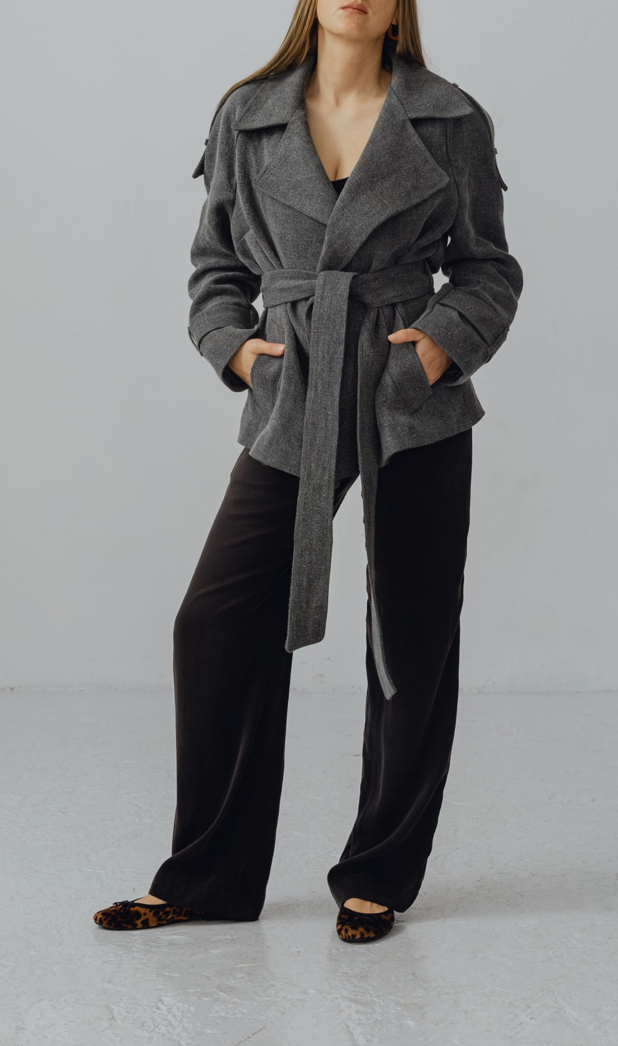 Krótki trencz uszyty z mięsistego 100% lnu o ciemnym grafitowym odcieniu. Lekko oversizowy, zamykany długim paskiem nadaje mocną formę twojej stylizacji. Reglanowy rękaw sam dopasuje się do twoich ramion przesadnie ich nie poszerzając.