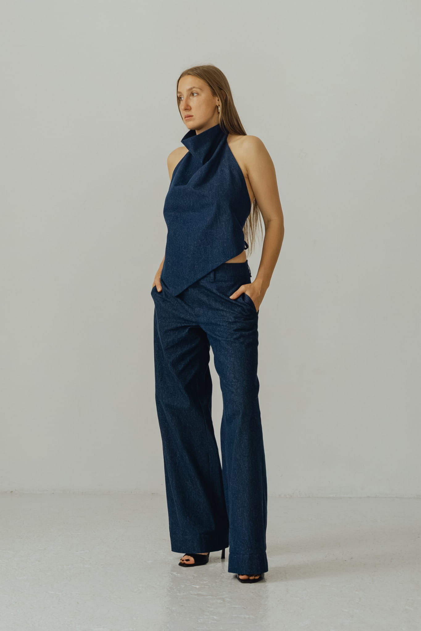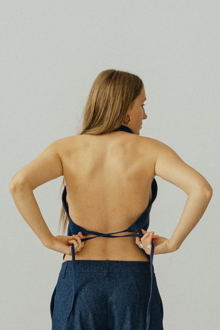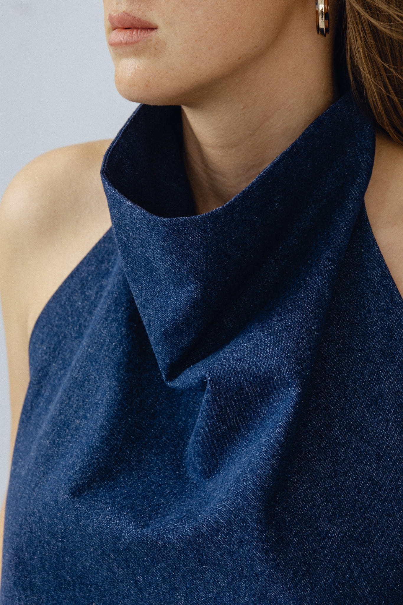 Asymetryczny top z dekoltem halter. Zapinany na szyi i wiązany w tali, zmysłowo odsłania całe plecy. Wysoki dekolt, zapinany na karku oblekanym guzikiem. Top szyty z podwójnej tkaniny, abyś czuła komfort w każdej sytuacji, możesz bez obaw nosić go bez biustonosza. Uszyty z jeansu o składzie 100 % bawełna .