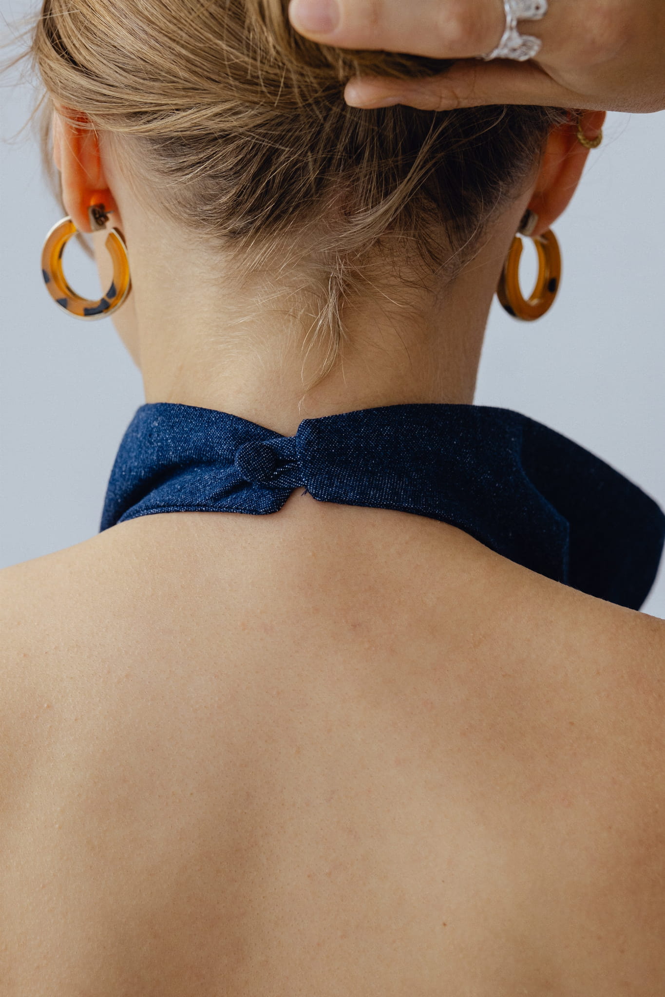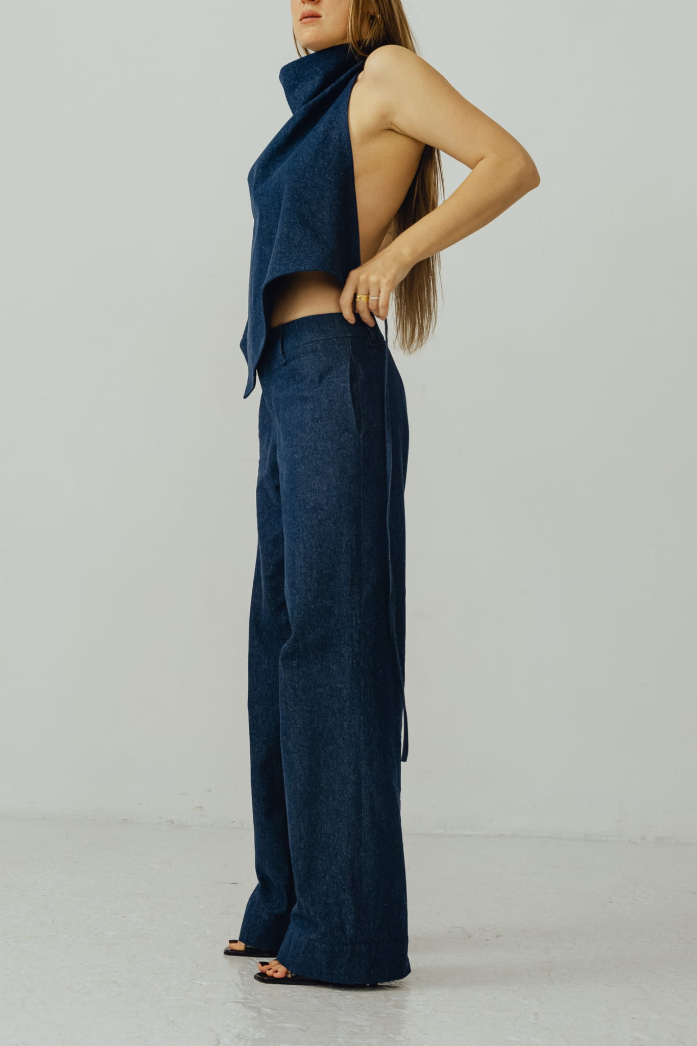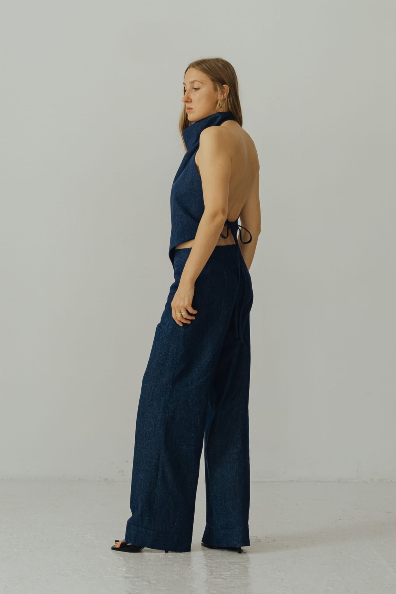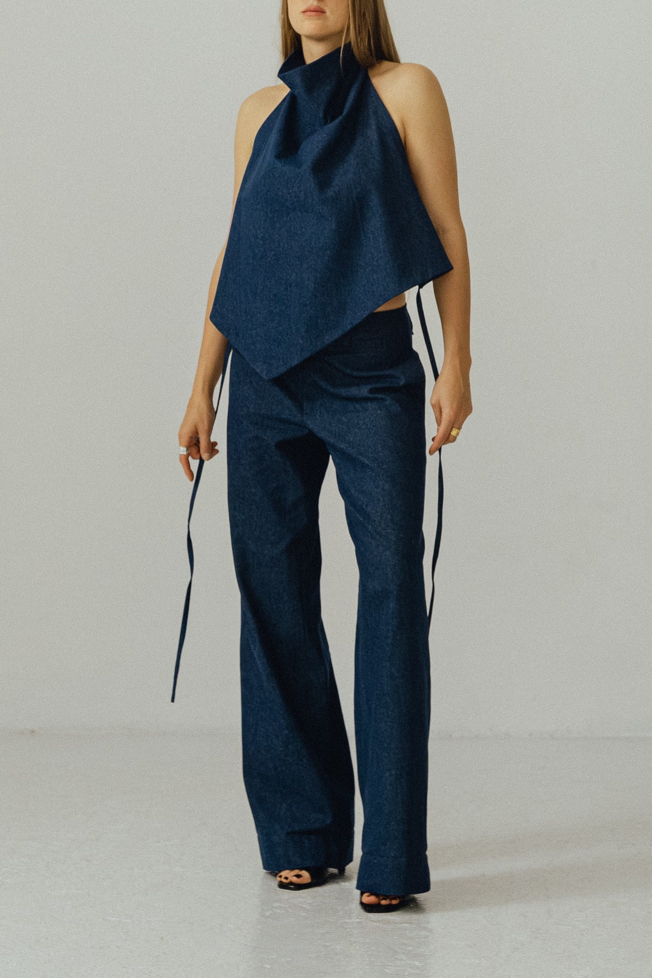 Asymetryczny top z dekoltem halter. Zapinany na szyi i wiązany w tali, zmysłowo odsłania całe plecy. Wysoki dekolt, zapinany na karku oblekanym guzikiem. Top szyty z podwójnej tkaniny, abyś czuła komfort w każdej sytuacji, możesz bez obaw nosić go bez biustonosza. Uszyty z jeansu o składzie 100 % bawełna .