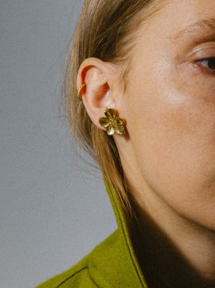 Kolczyk w formie pięciopłatkowego kwiatu, oparty na zwartej, delikatnie asymetrycznej kompozycji. Każdy z płatków buduje miękką, zaokrągloną linię, która układa się blisko ucha, tworząc spójną, kompaktową i zarazem lekką bryłę.