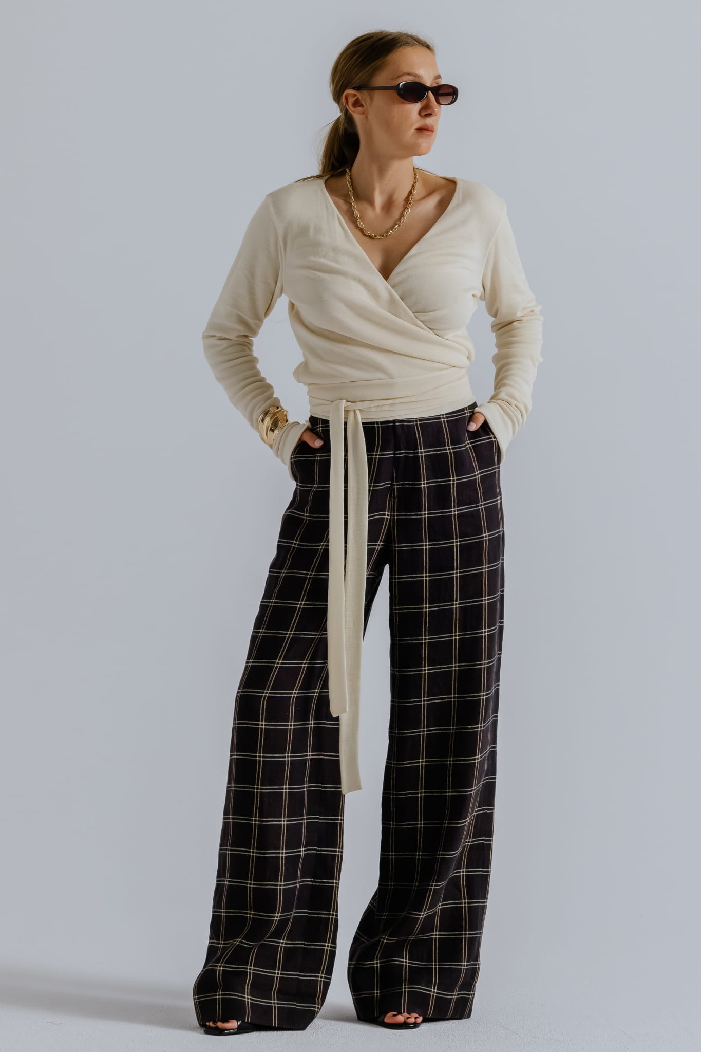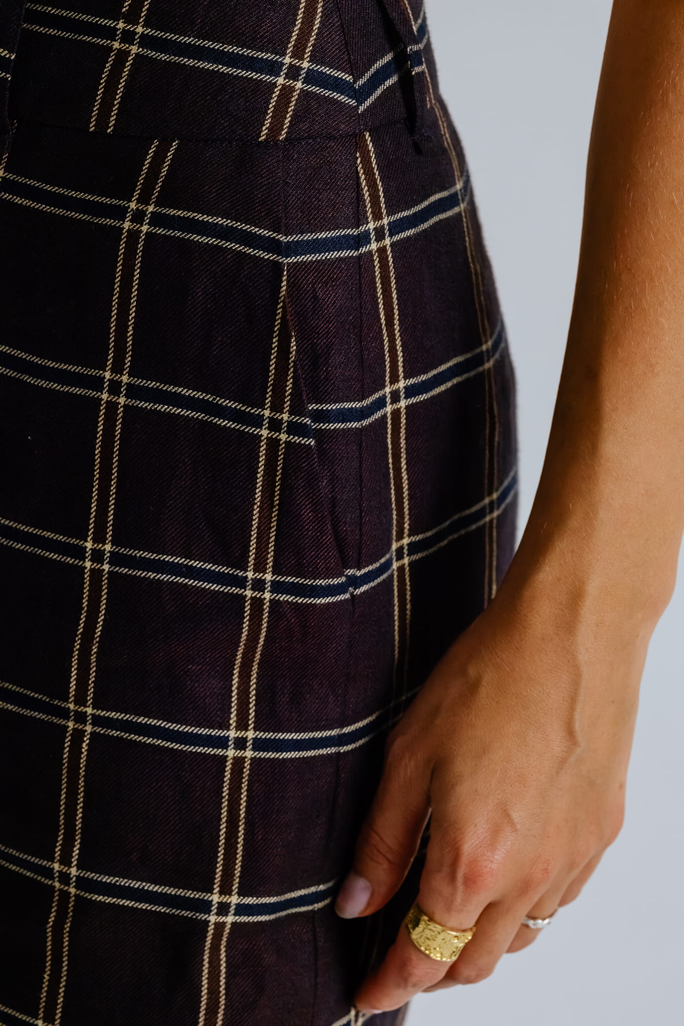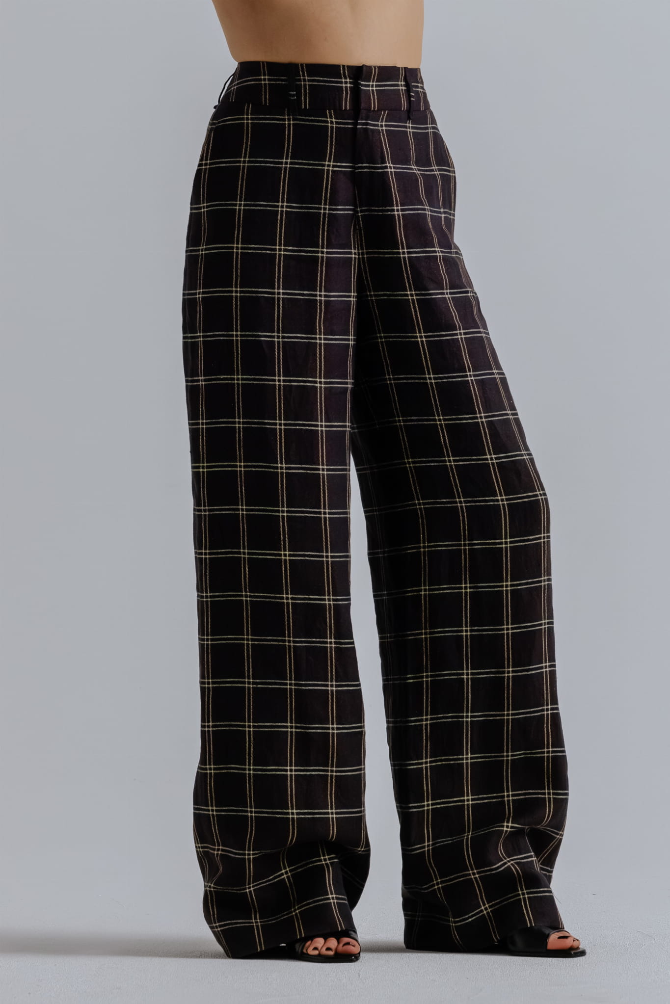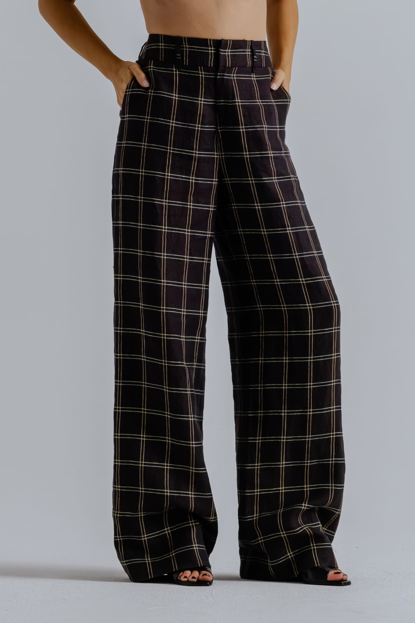 Spodnie z wysokim stanem, uszyte z przewiewnej mieszanki lnu i bawełny w kratę, łączą klasyczną formę z nowoczesną dbałością o detal.