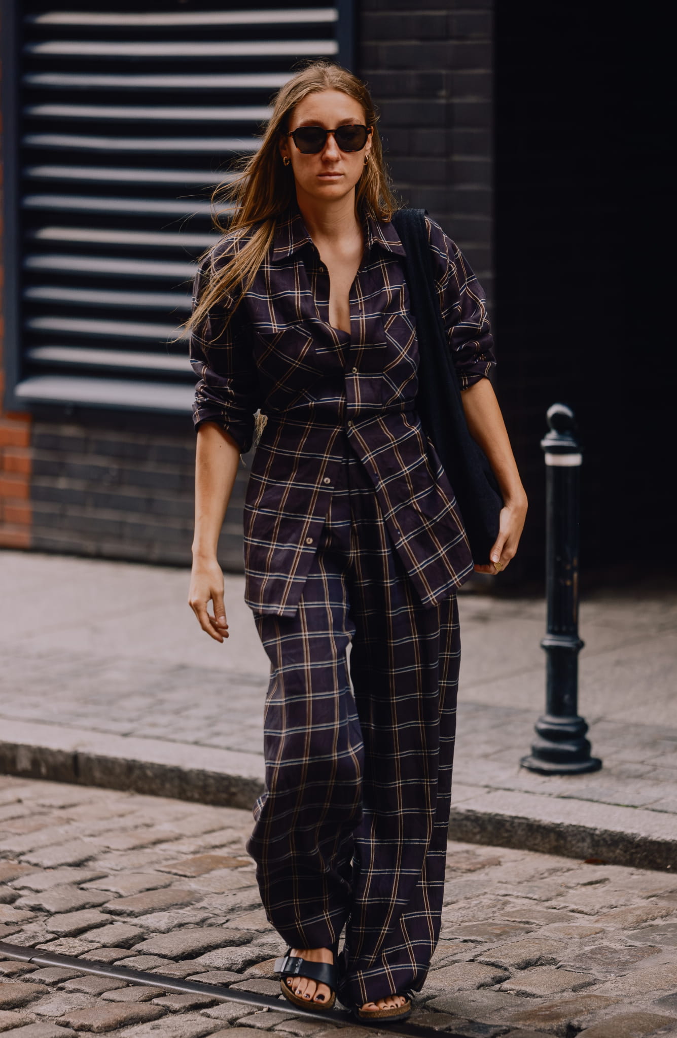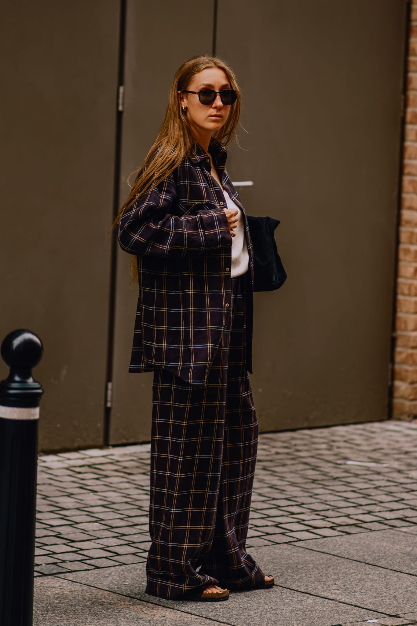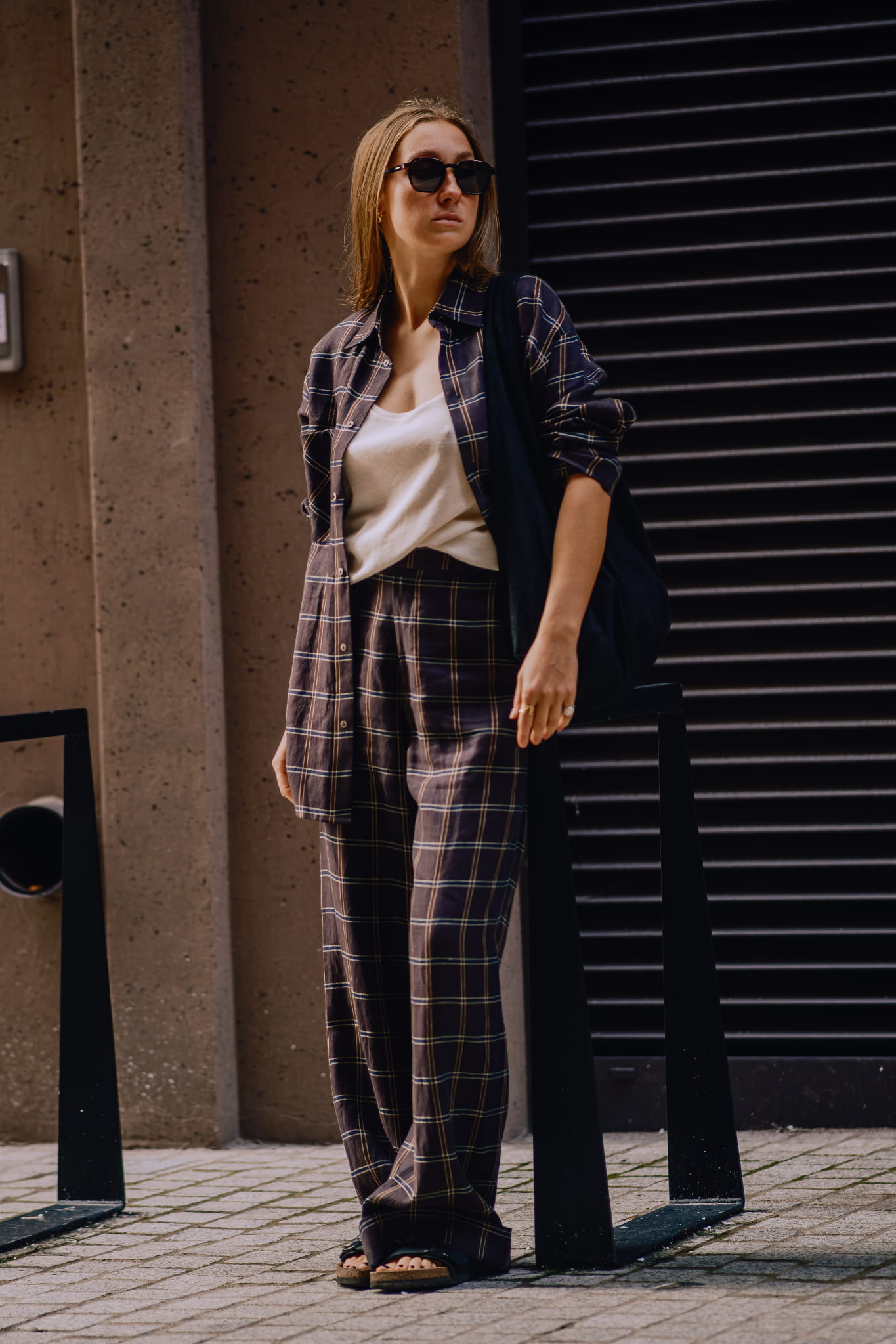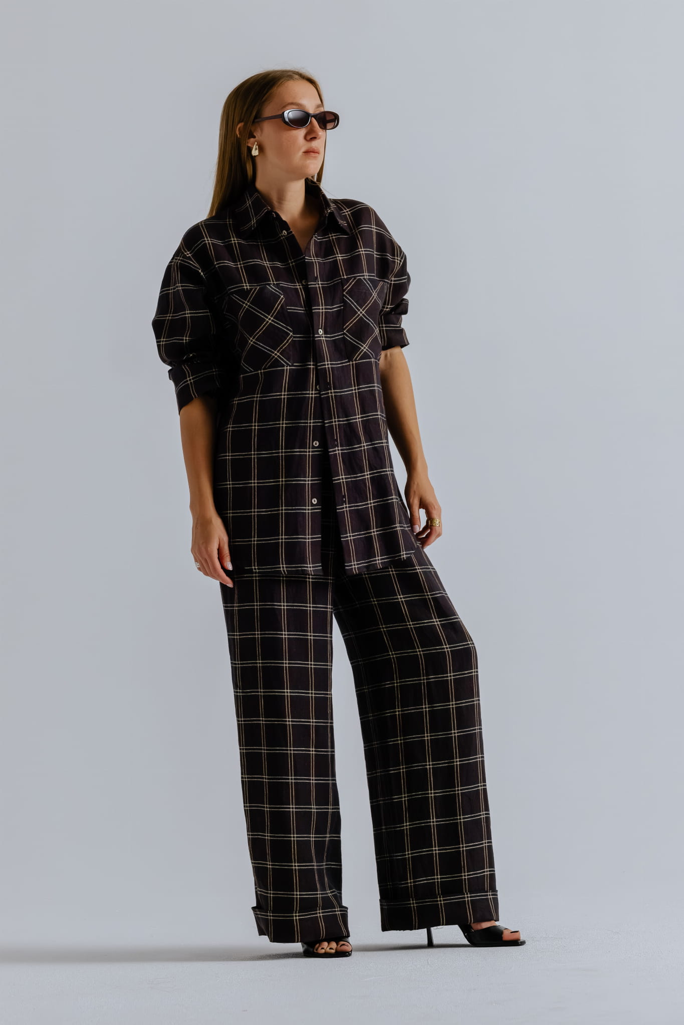 Spodnie z wysokim stanem, uszyte z przewiewnej mieszanki lnu i bawełny w kratę, łączą klasyczną formę z nowoczesną dbałością o detal.