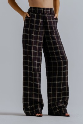 Spodnie w kratkę z wysokim staniem i prosta nogawką.