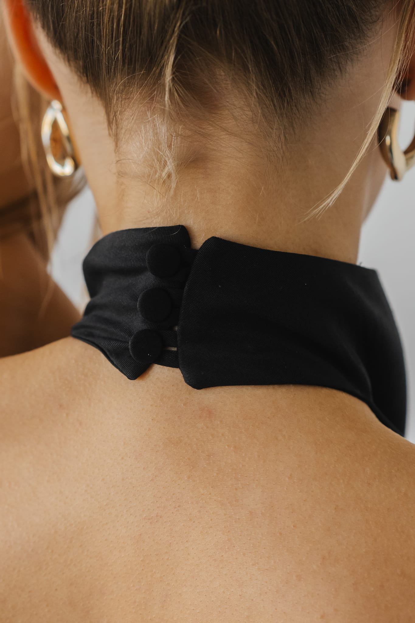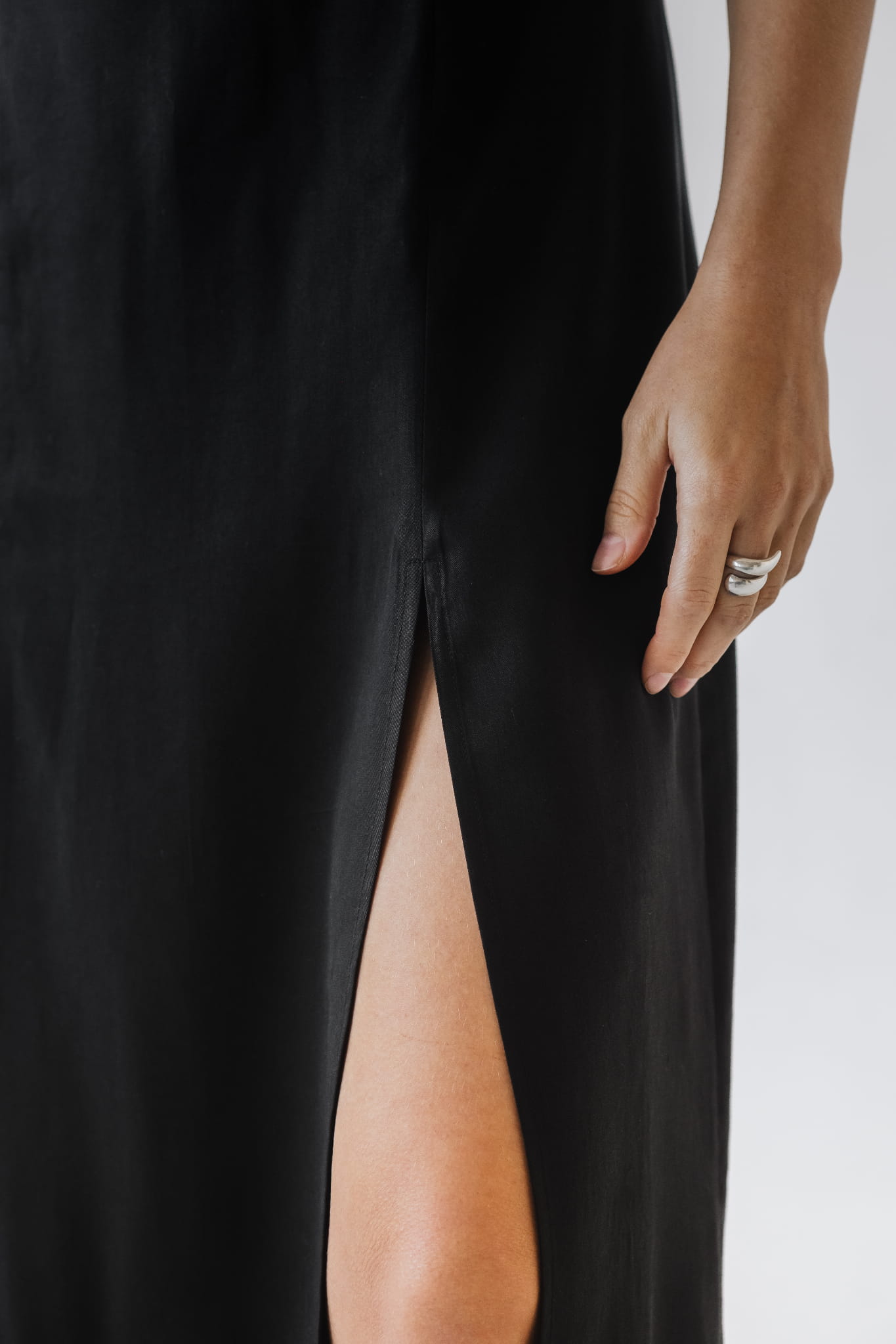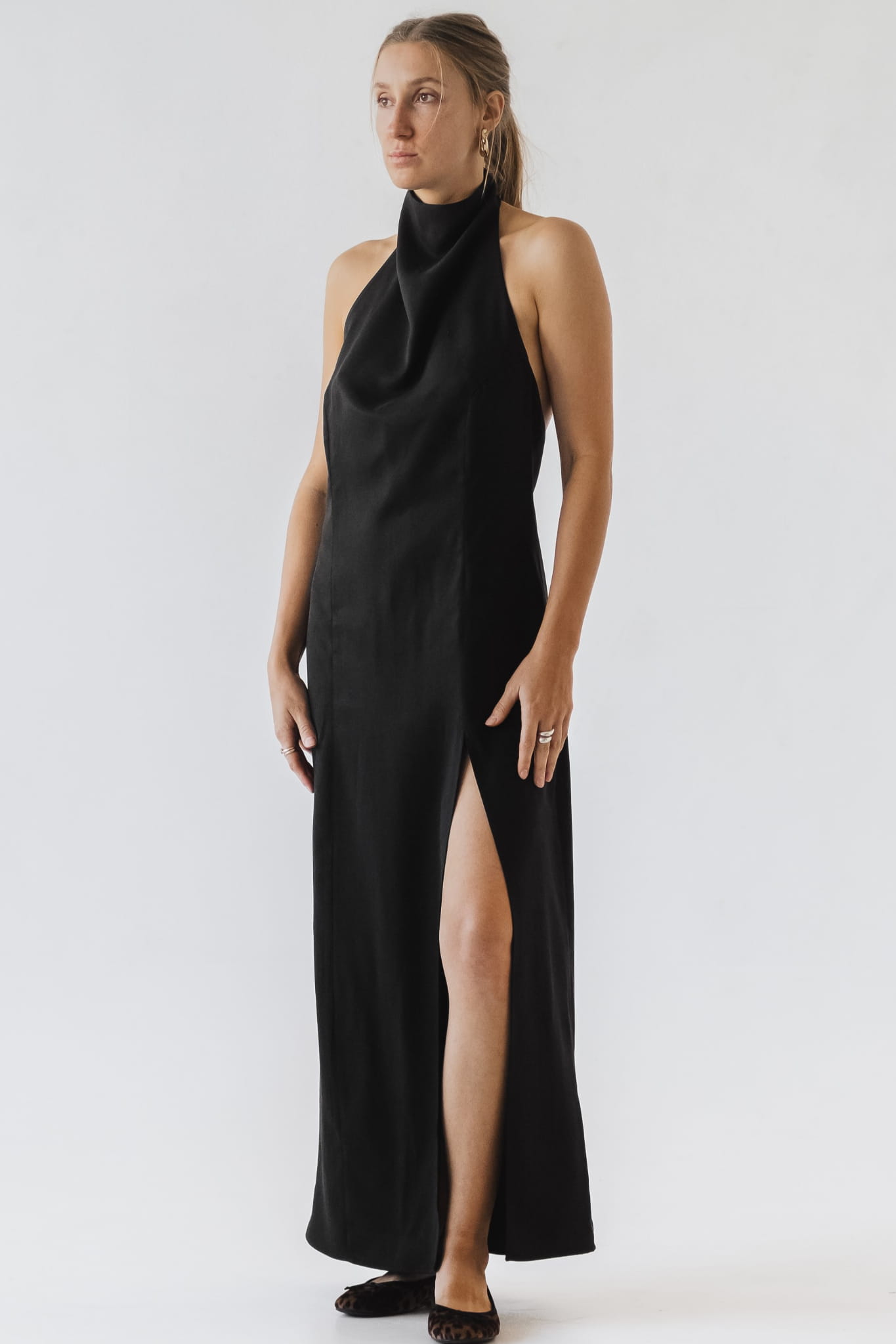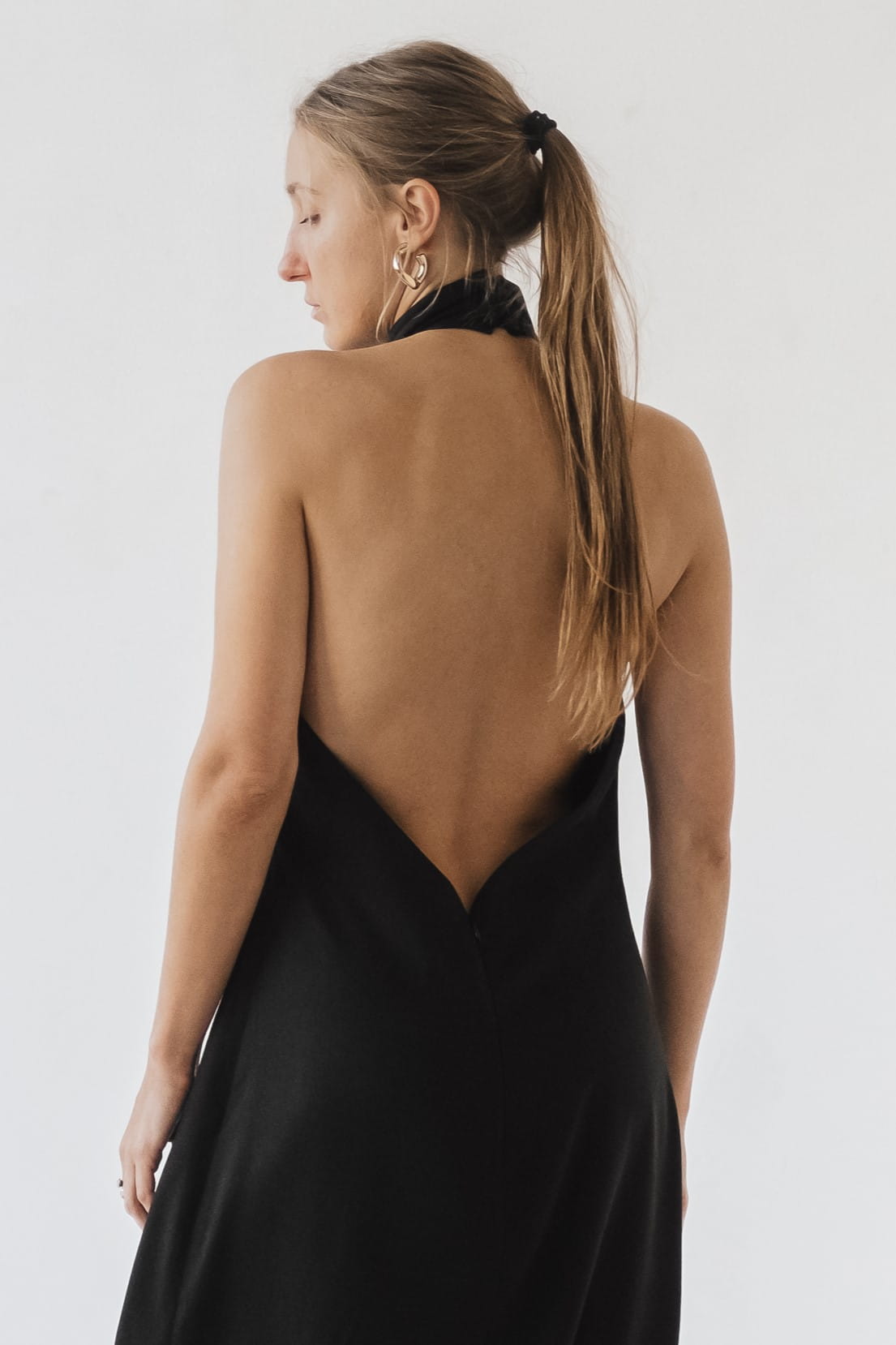 Długa sukienka z dekoltem halter. Mocno wycięte plecy i rozporek na lewej nodze. Na karku zapinana oblekanymi guzikami oraz krytym zamkiem w linii szwu. W dekolcie znajduję się podwójna warstwa materiału dla twojego komfortu. Uszyta bardzo przyjemnego w odczuciu tencelu.