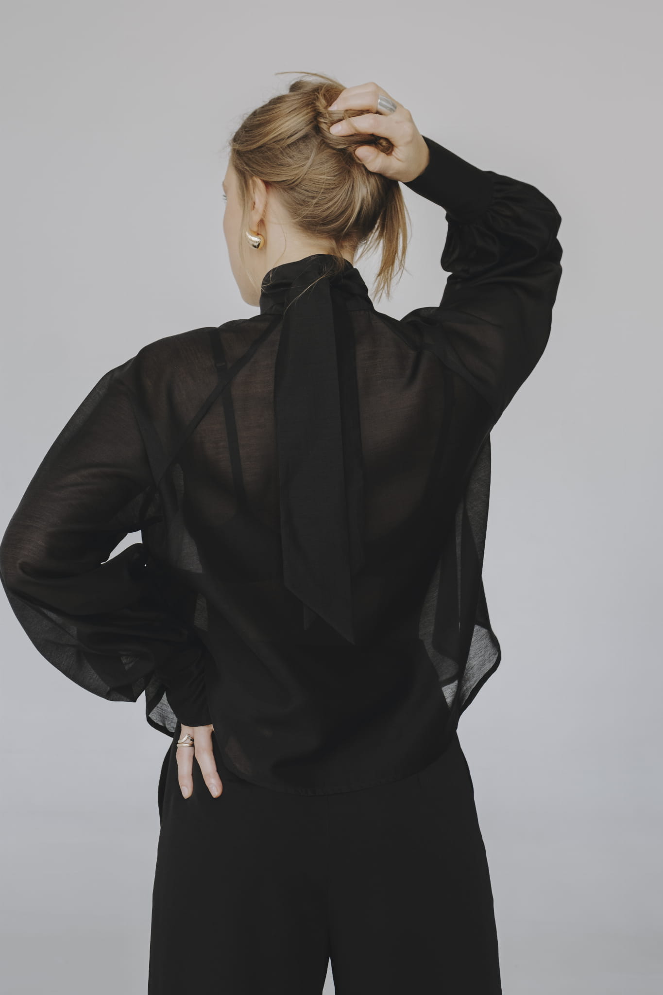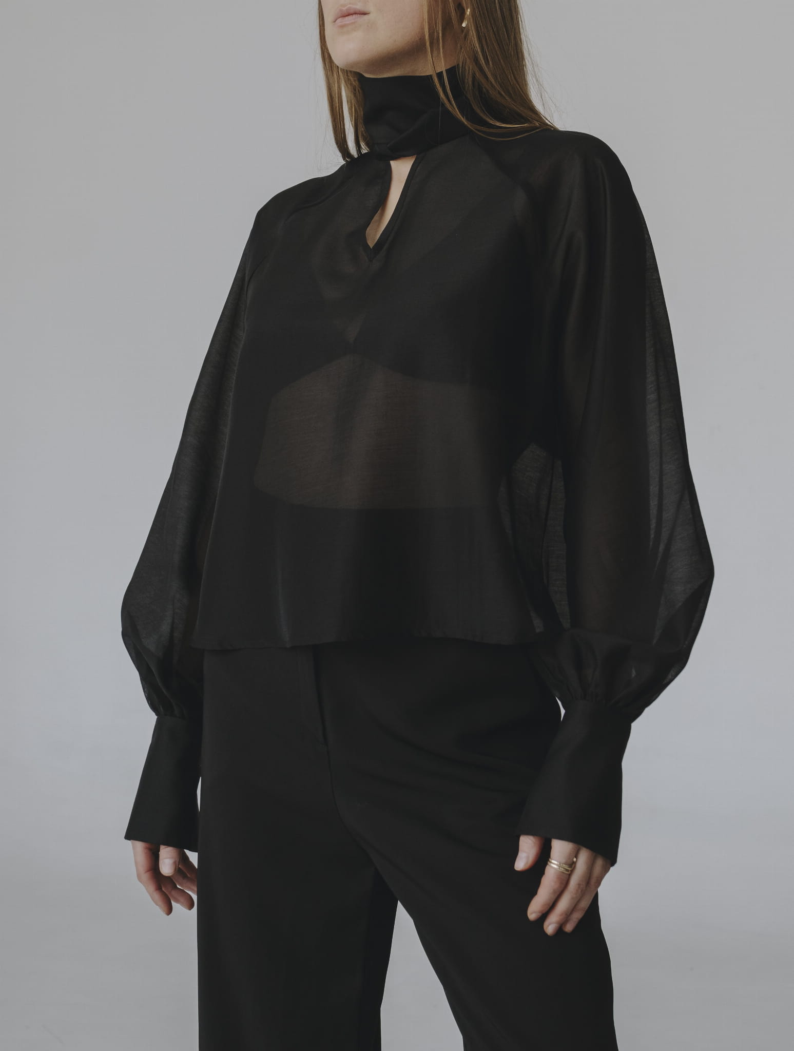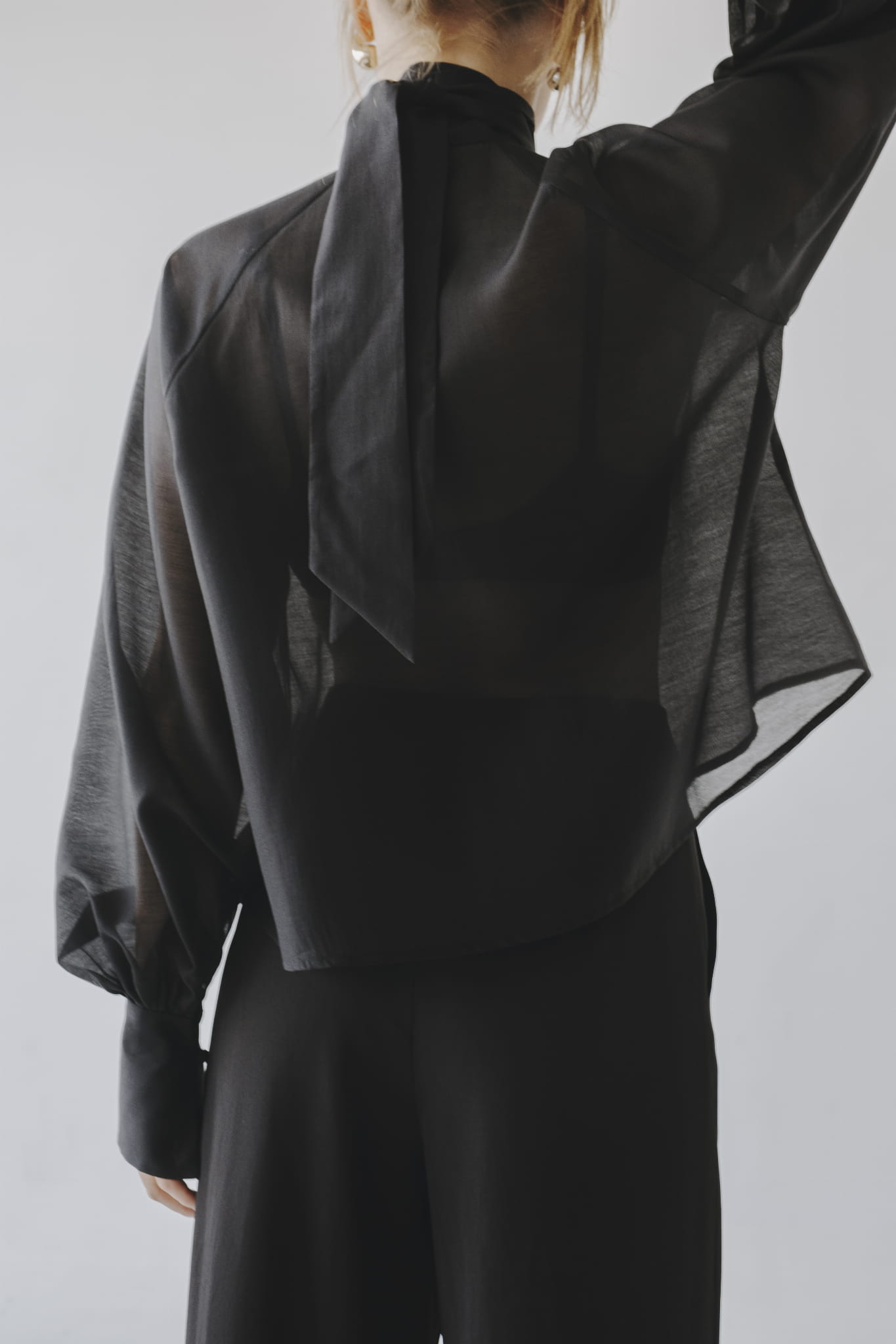 Transparentna czarna koszula over-size, długi rękaw wykończony mankietem, dekoltem V i szarfa pod szyją to tylko kilka zalet tego modelu.