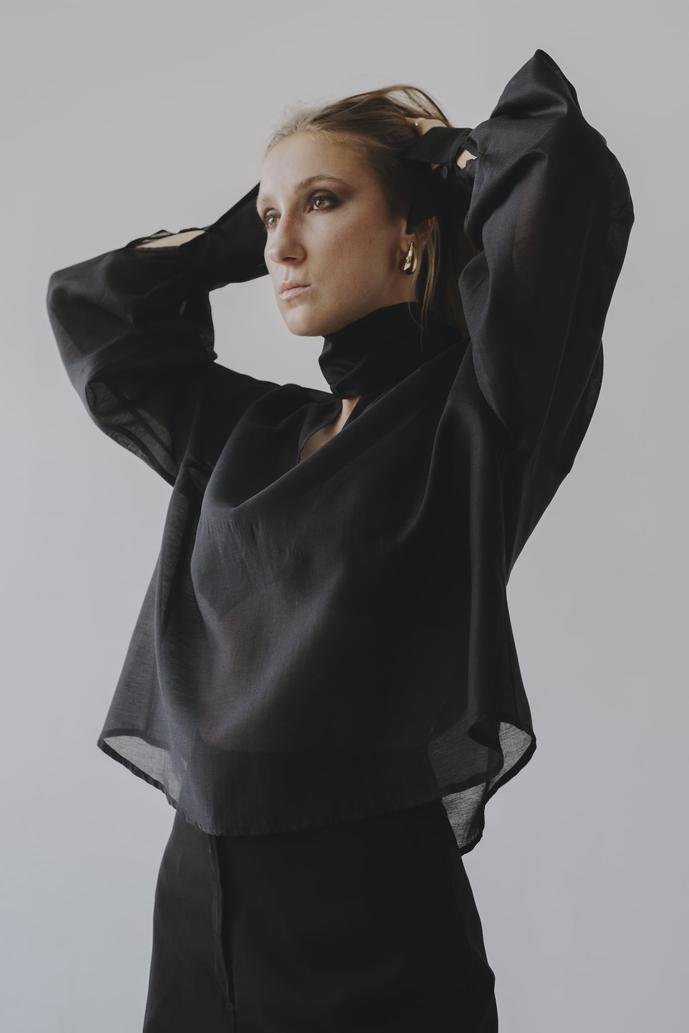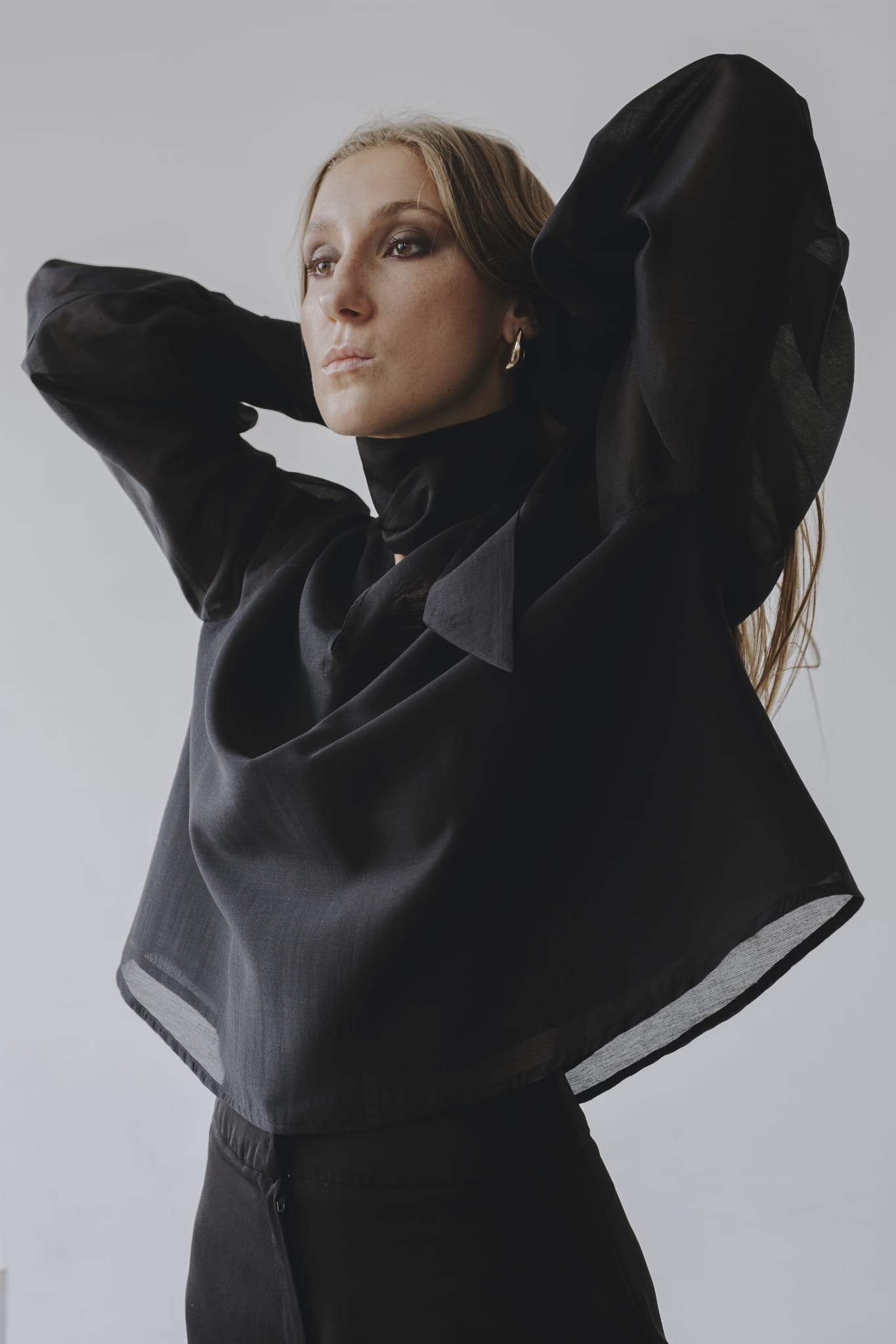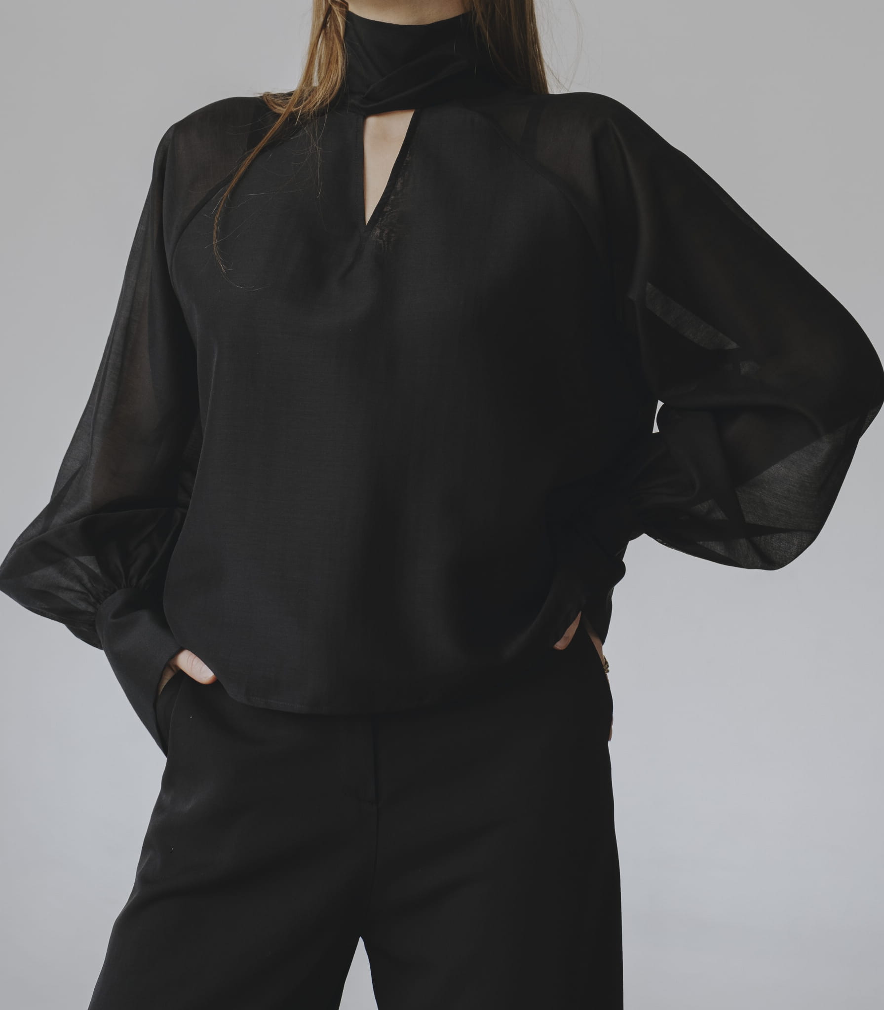 Transparentna czarna koszula over-size, długi rękaw wykończony mankietem, dekoltem V i szarfa pod szyją to tylko kilka zalet tego modelu.