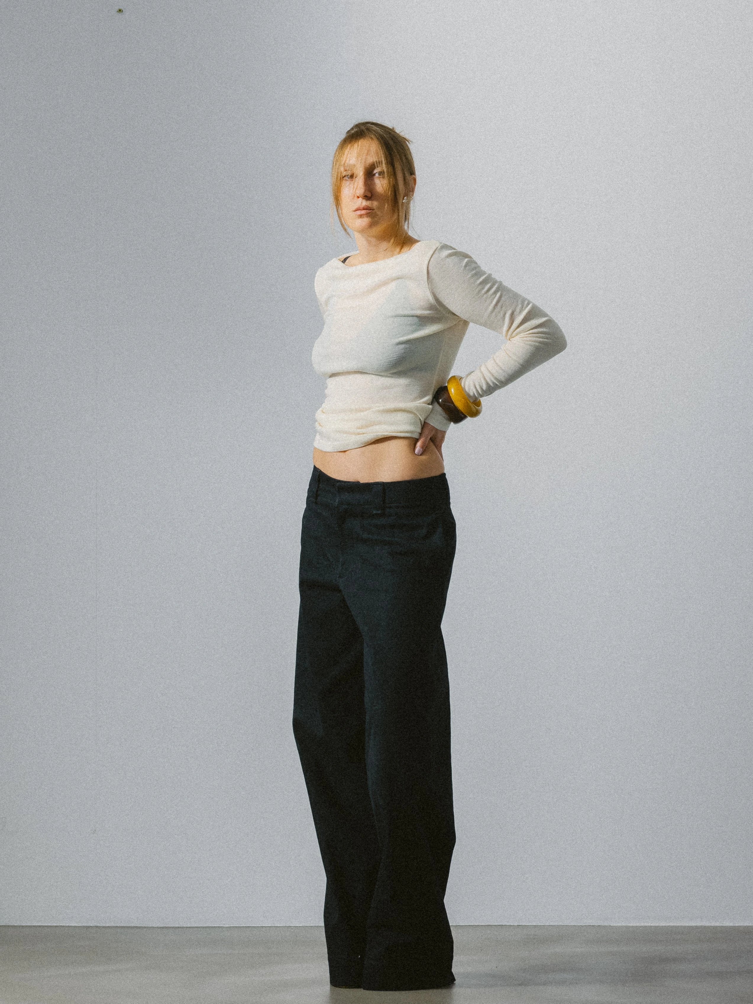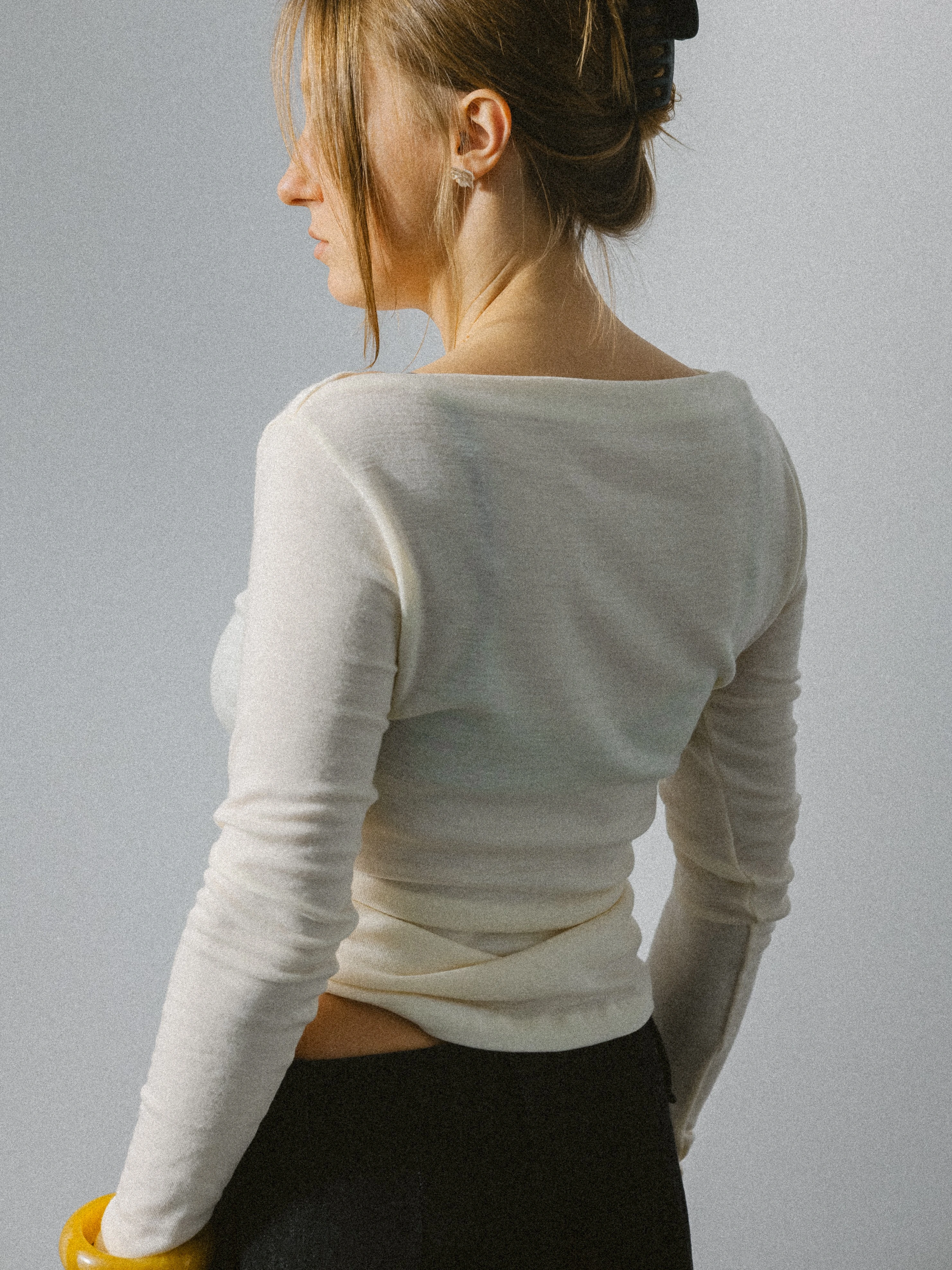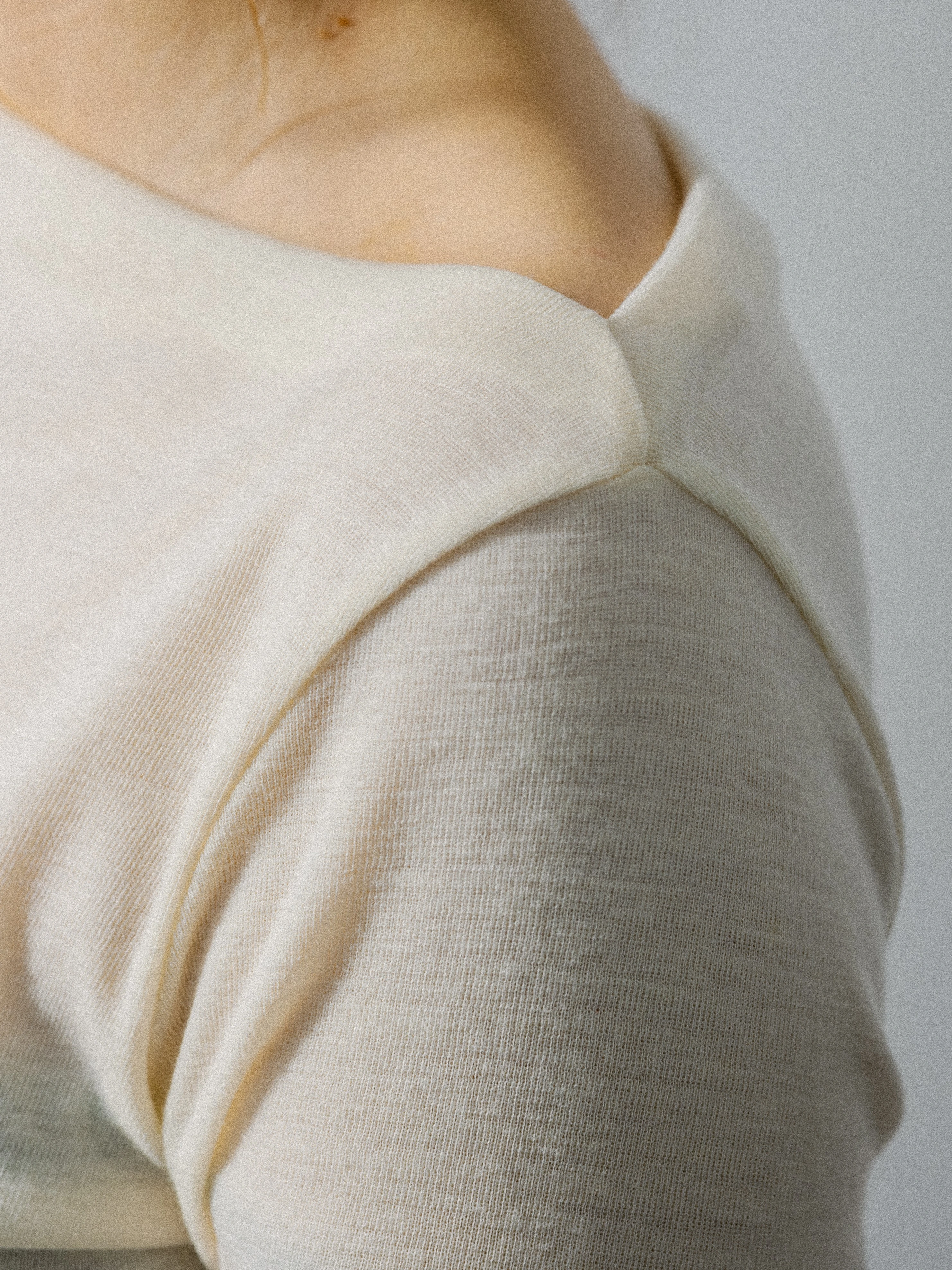 Bluzka z długim rękawem wykonana z delikatnej dzianiny 100% wełna o sweterkowym splocie w odcieniu ecru. Forma oparta na miękkiej, płynnej linii, która swobodnie układa się na sylwetce, zachowując wyważone proporcje.