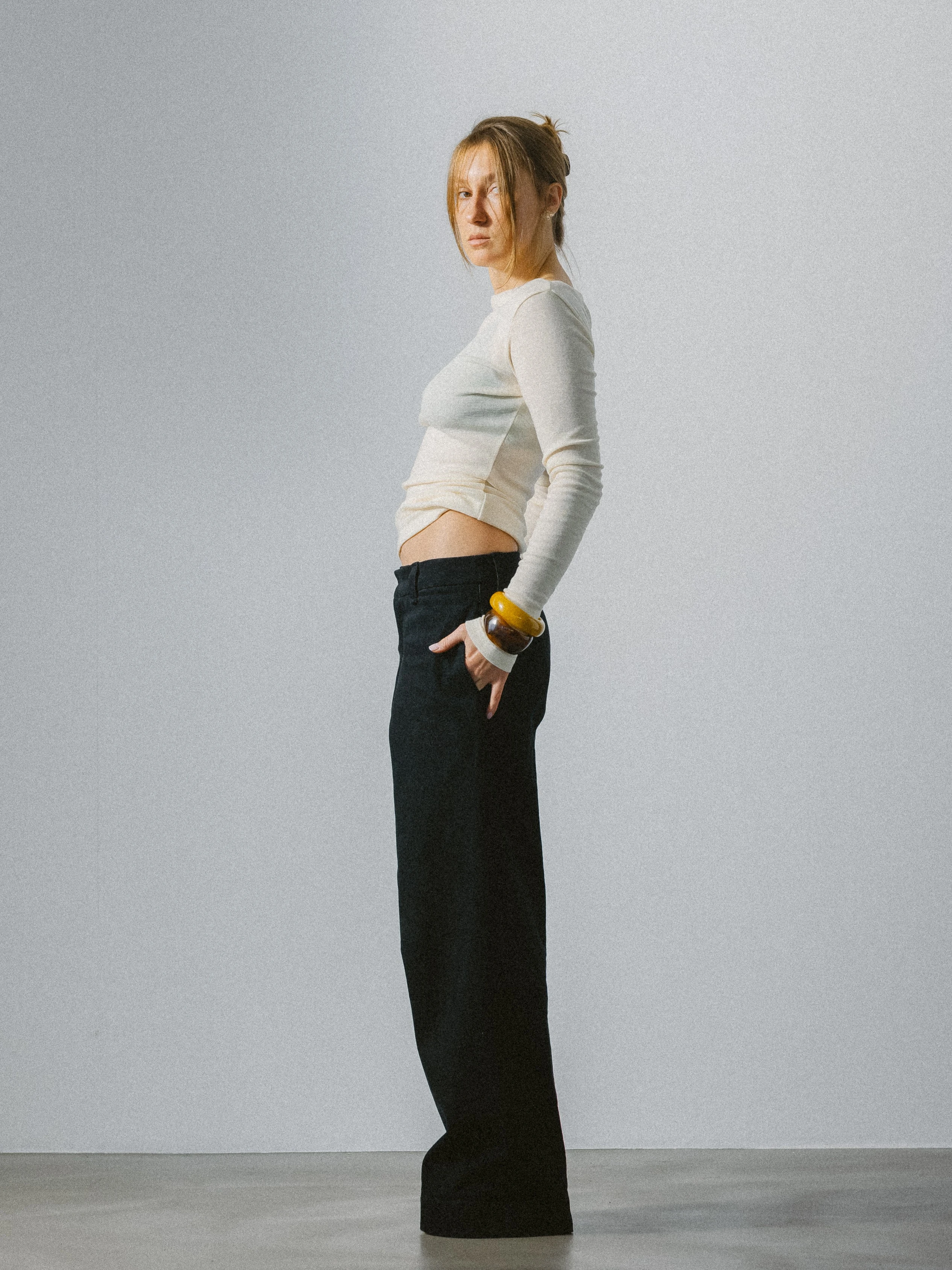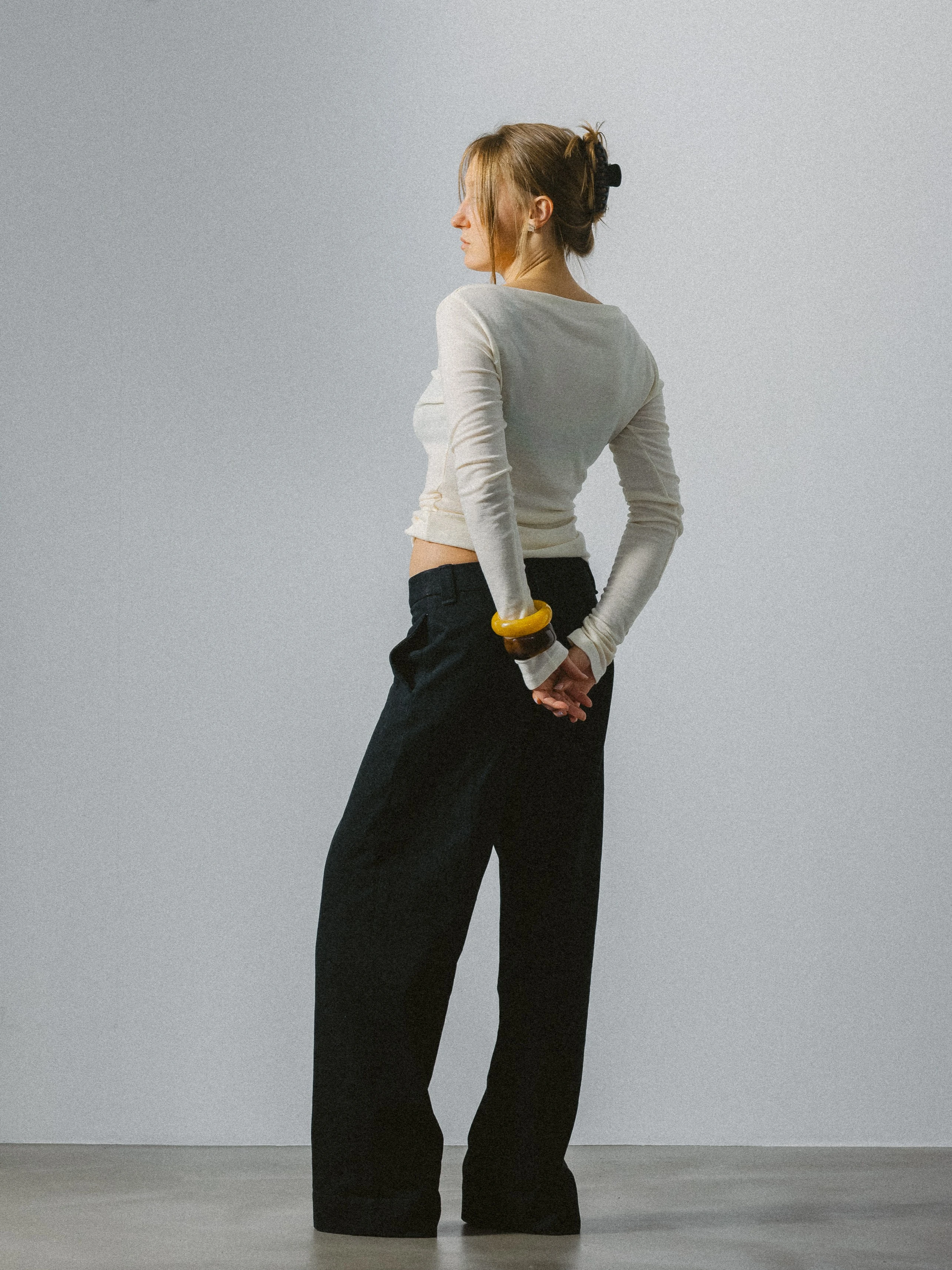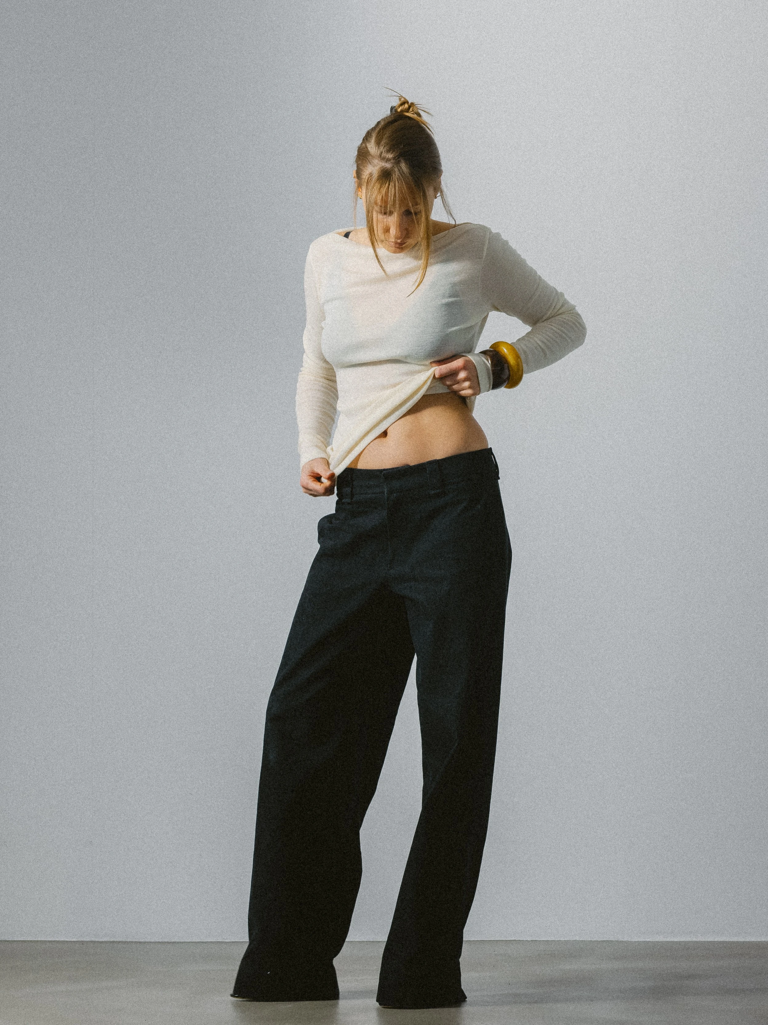 Bluzka z długim rękawem wykonana z delikatnej dzianiny 100% wełna o sweterkowym splocie w odcieniu ecru. Forma oparta na miękkiej, płynnej linii, która swobodnie układa się na sylwetce, zachowując wyważone proporcje.
