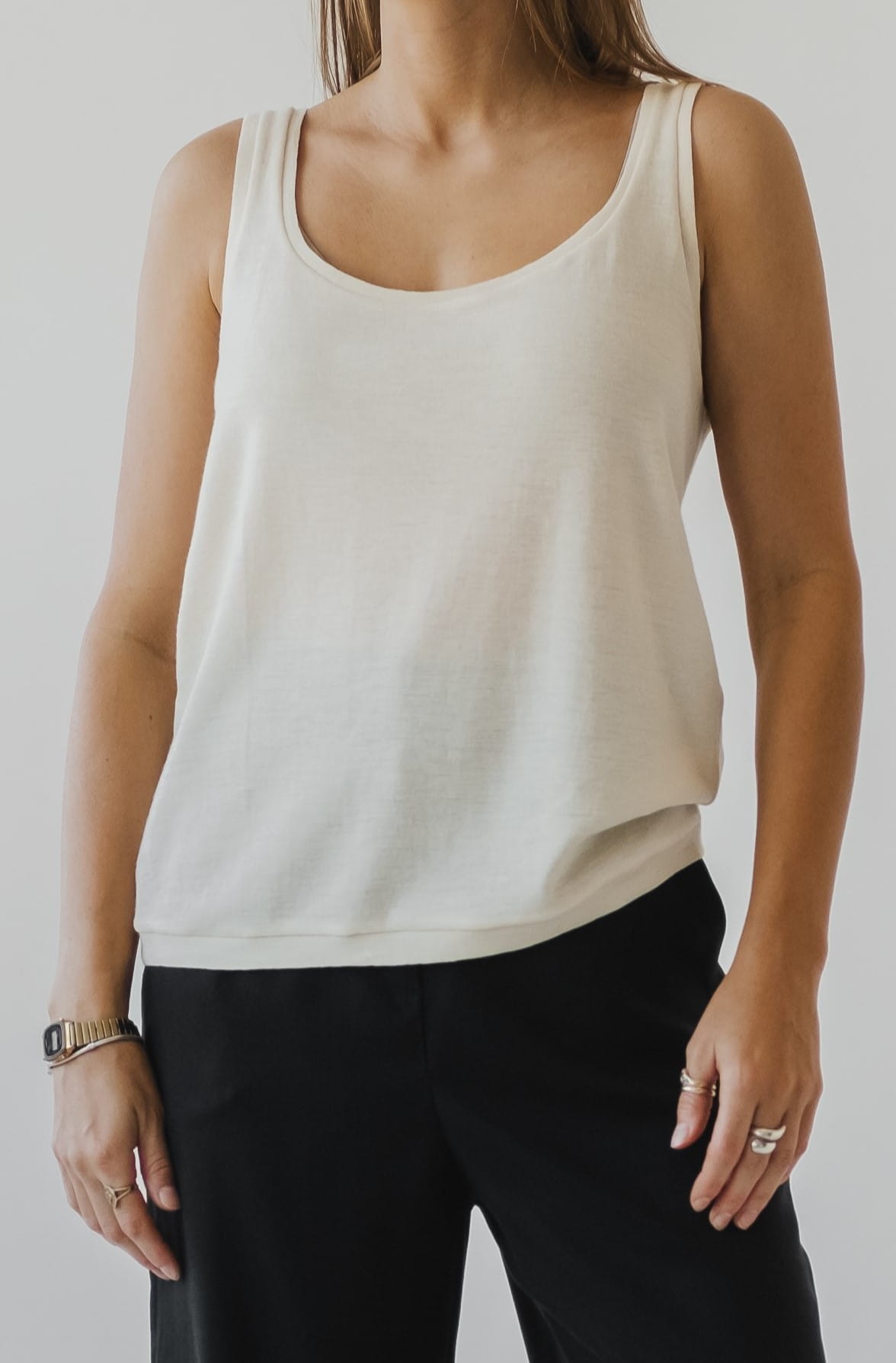 Wełniany top na ramiączka w kolorze ecru. Dekolt w łódkę, lekko oversizowy krój, oraz subtelnie obniżony podkrój pachy, nadaje całości odrobinę nonszalancji, ale spokojnie nie musisz martwić się o biustonosz. Delikatna dzianina o lekko sweterkowej strukturze, jest bardzo przyjemna w noszeniu, ponad to jest wyprodukowana z certyfikowanej 100% wełny merino, więc bluzeczka dosłownie otula ciało.
